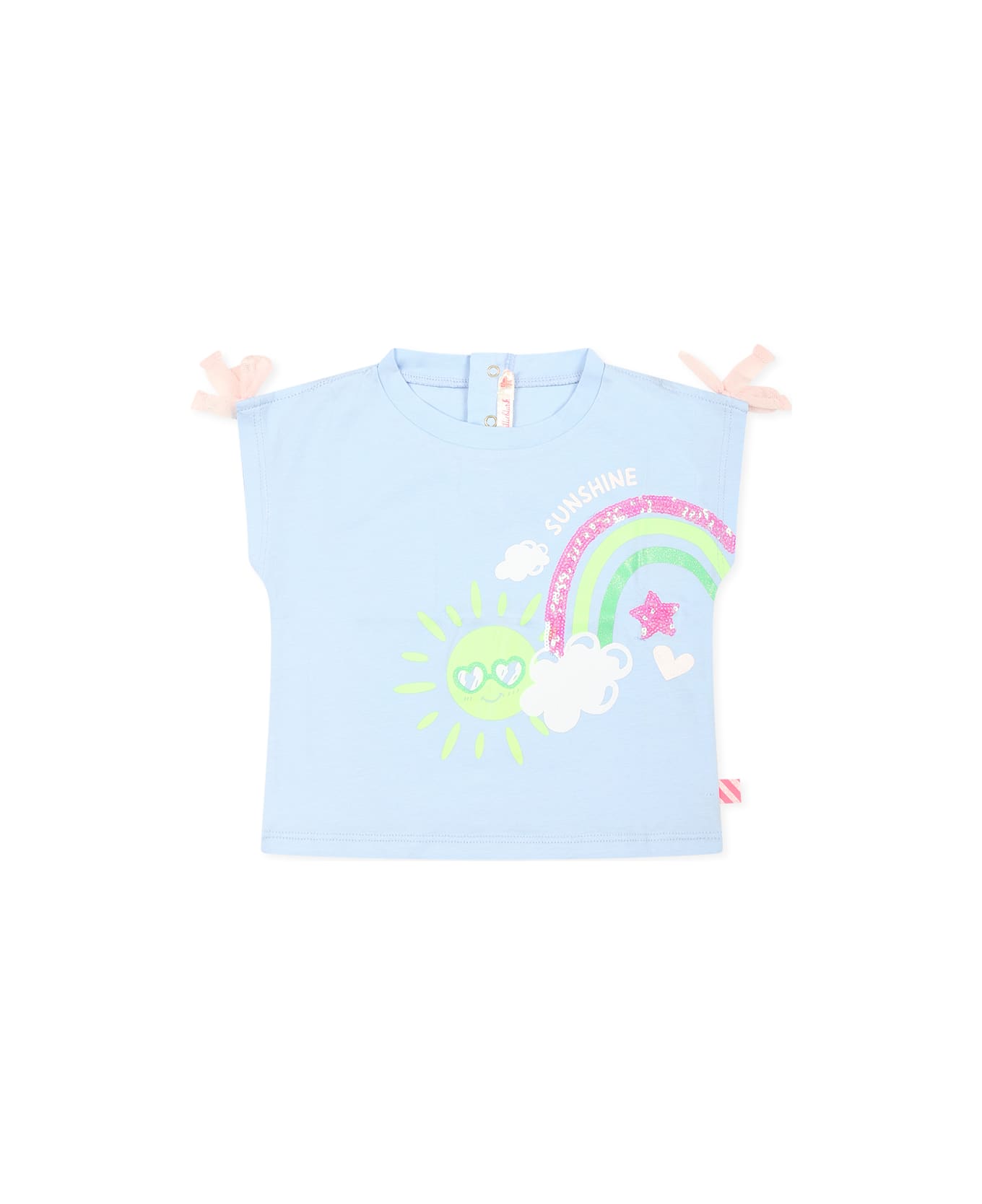 Light blue cotton t-shirt, short sleeves, with crew neck, snap button closure on the back and bows applied on the shoulders. It is embellished with rainbow sequins, sun and writing on the front.