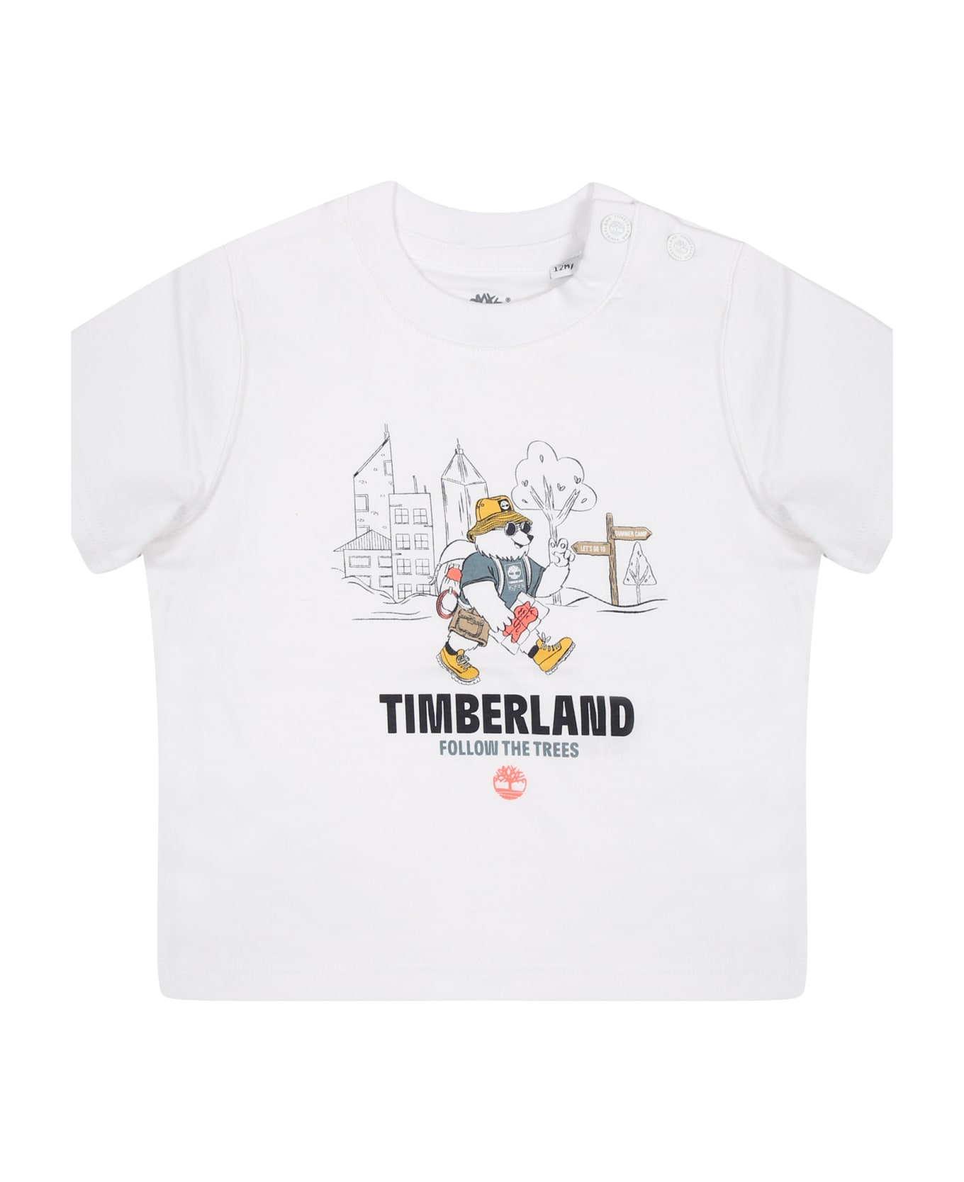 White cotton T-shirt, short sleeves, ribbed crew neck and snap buttons on the shoulders. It is embellished with print on the front.