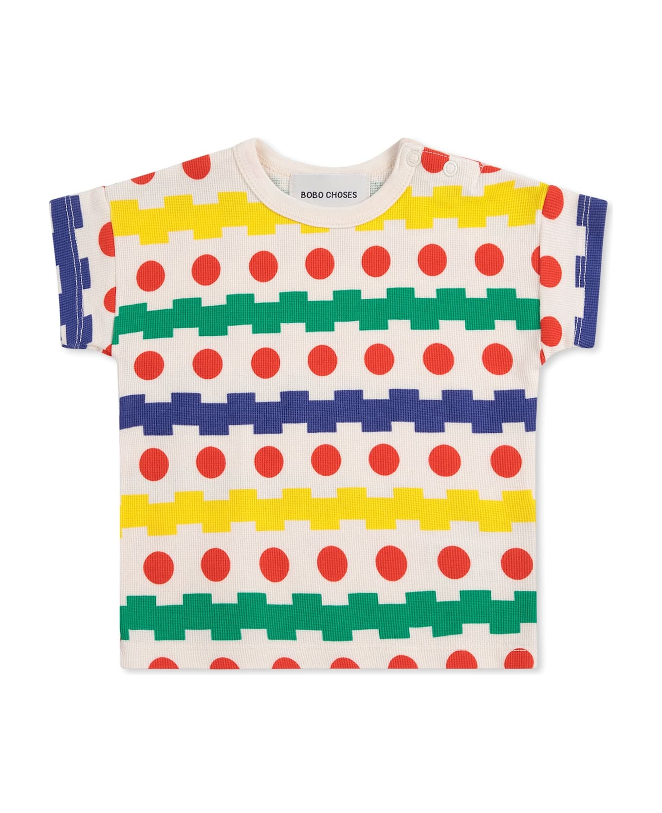 White organic cotton t-shirt with short sleeves, ribbed crew neck and snap button fastening on the shoulder. It is embellished with all-over geometric print.