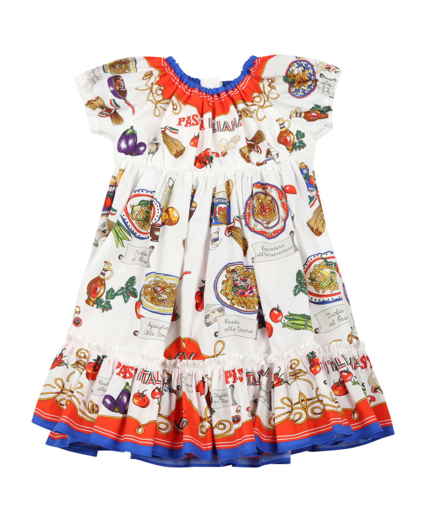 White cotton dress, with short sleeves, culotte, elastic crew neck, flounce on the bottom and zip closure, on the back. It s embellished with black logos and colorful iconic prints.