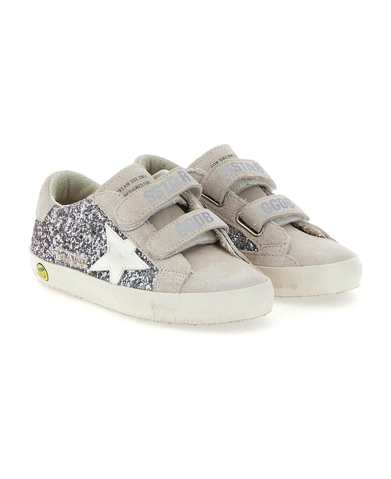 KIDS 'Old School' suede and glitter sneakers, contrast side star, Velcro band closure and logo print, rubber sole with vintage effect treatment.