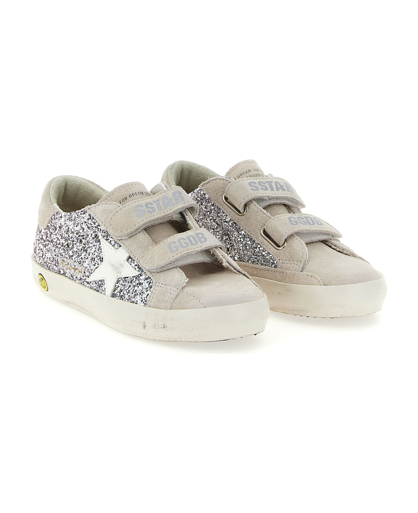 KIDS 'Old School' suede and glitter sneakers, contrast side star, Velcro band closure and logo print, rubber sole with vintage effect treatment.