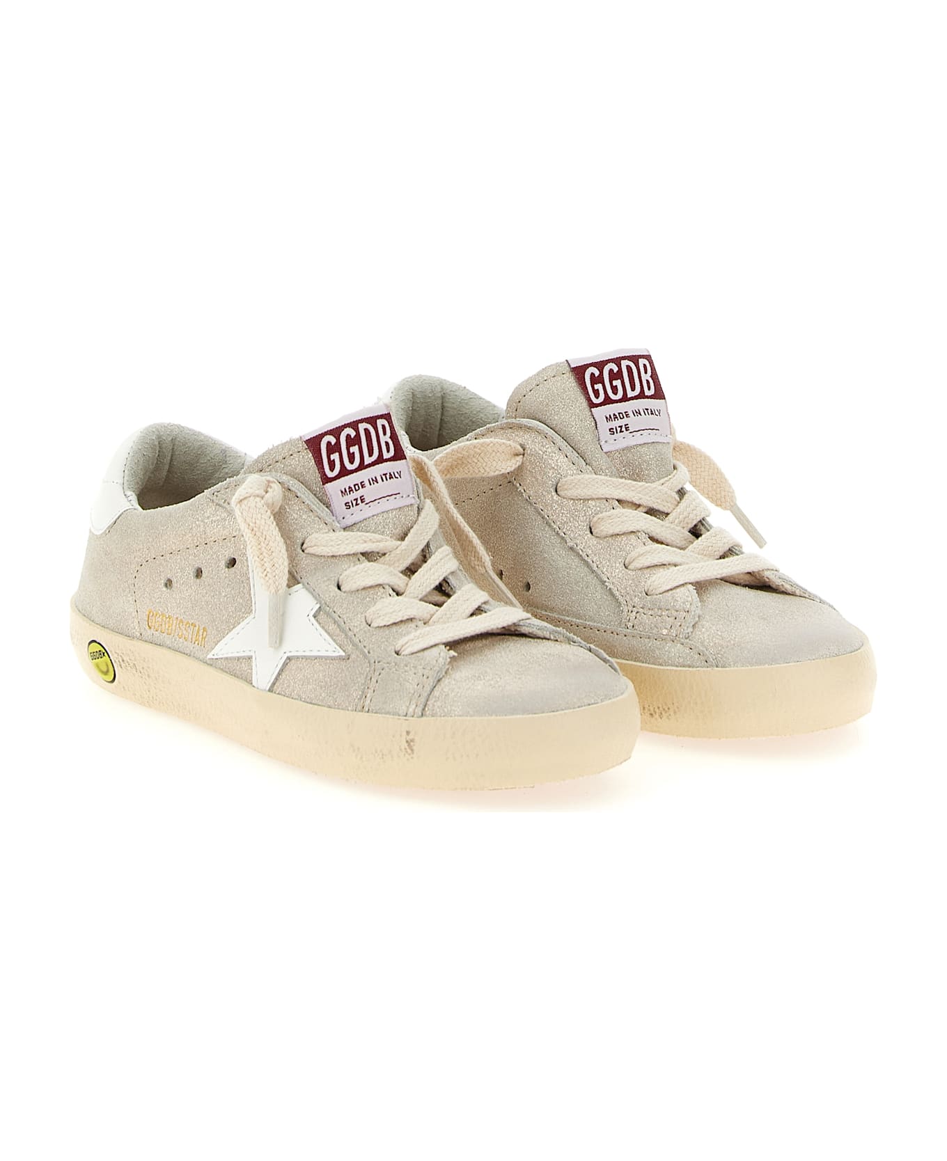 KIDS 'Superstar' sneakers in used-effect laminated suede, contrast leather star and heel, lace-up closure, rubber sole.