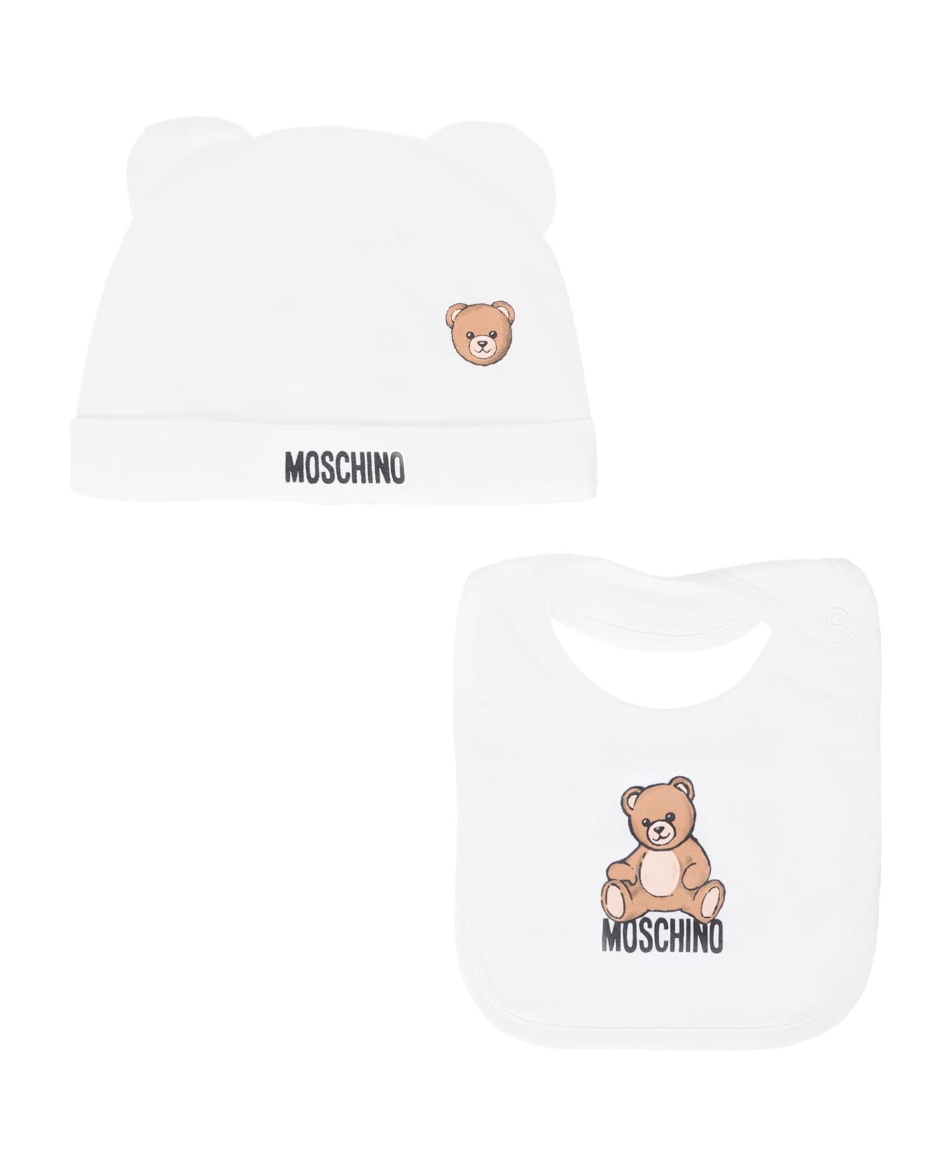 Ivory set composed of cotton hat and bib; hat with lapels and ears on top; bib with pink outline and side snap closure. They are embellished with Teddy Bear and logo on the front.