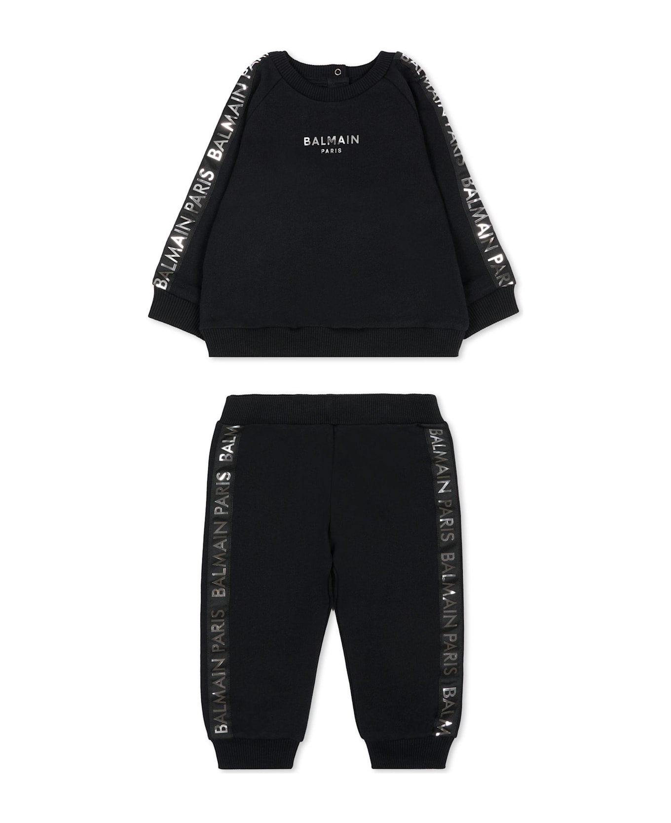 Black organic cotton suit composed of sweatshirt and trousers. Long-sleeved sweatshirt with a ribbed crew neck, snap button closure on the back, logo stripes on the shoulders and sleeves, and ribbed cuffs and hem. Trousers with an elastic waist, side pockets, ribbed cuffs, and logo side stripes. It is embellished with a silver Balmain logo.