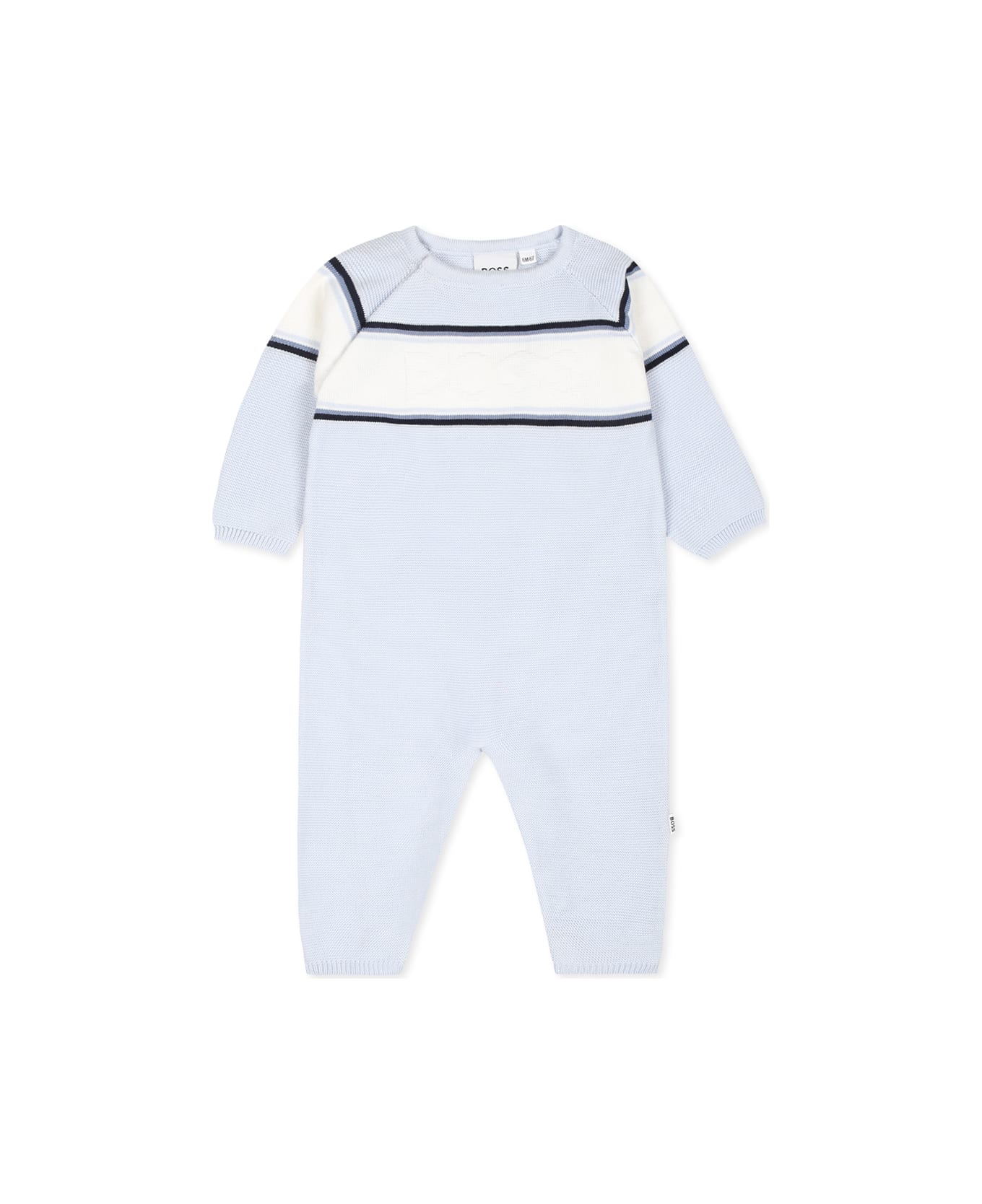 Light blue knit romper with long sleeves, crew neck, ribbed hem and cuffs, and snap button closure between the legs. It is embellished with white band on top with logo and side logo patch.