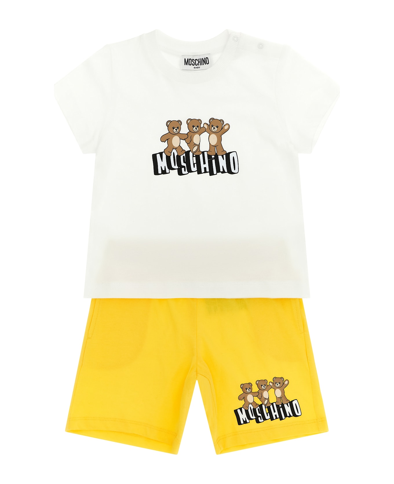 Cotton jersey suit with front 'Moschino Teddy Bear' print consisting of crewneck t-shirt, snap buttons on the left shoulder, short sleeves and Bermuda shorts with elastic waistband and pockets. Composition: 100% cotton