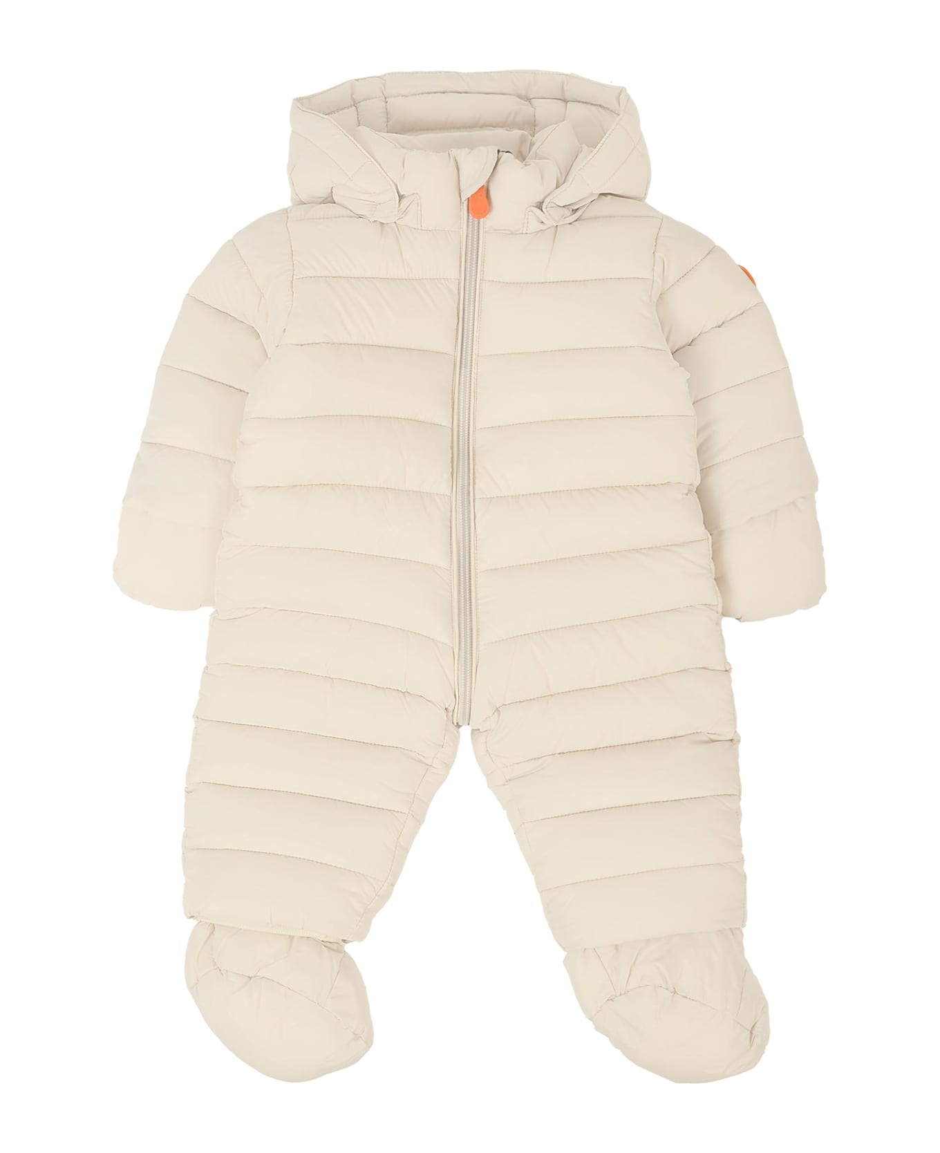 Lightly padded and quilted beige down jacket, with removable hood, long sleeves, zip fastening on the front and between the legs, ribbed cuffs and ankles, feet and removable mittens. It is embellished with an iconic orange rubber logo applied on the sleeve; it is padded with Plumtech, a synthetic thermal wadding, made with respect for the environment and animals; it is breathable and retains heat.
