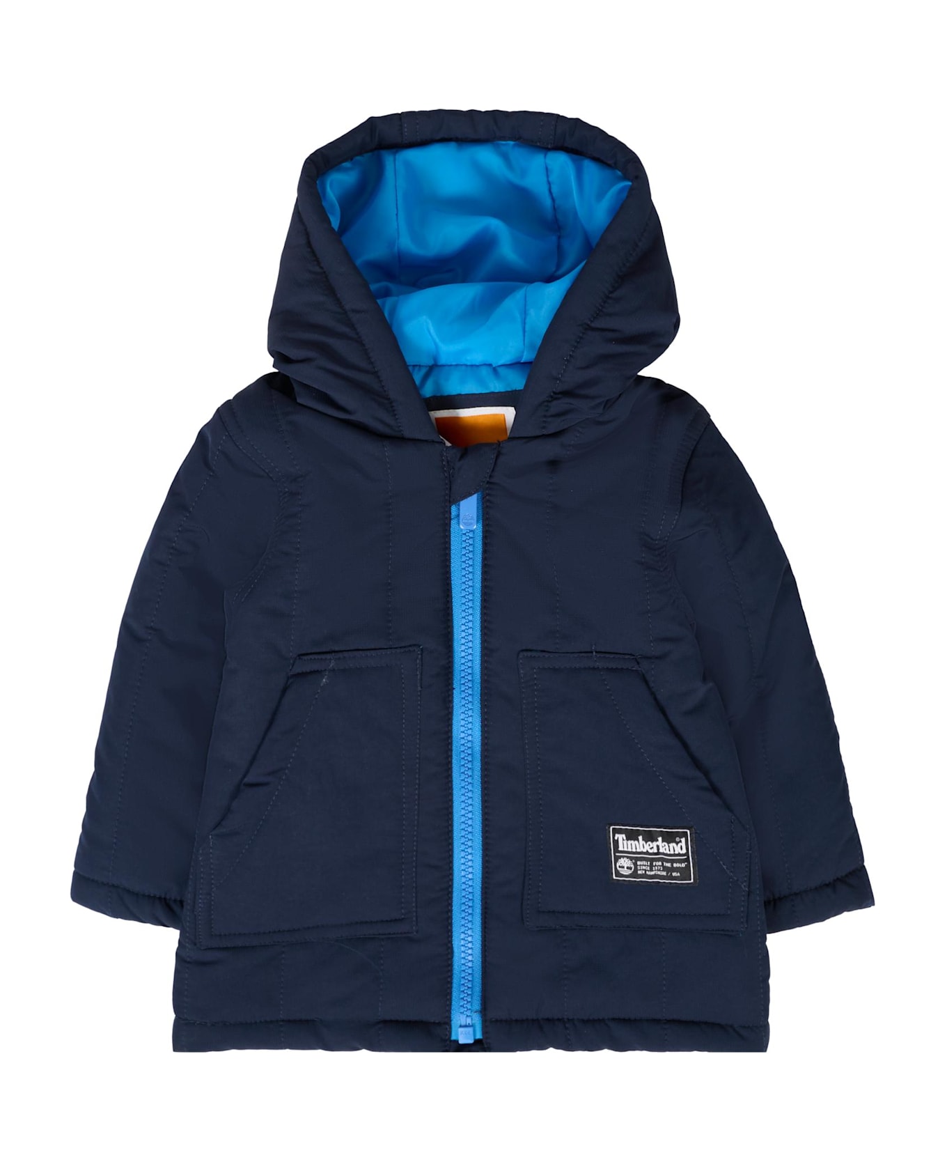 Lightly padded and quilted blue down jacket, long sleeves, with hood, front zip fastening and pockets applied on the front. It is decorated with a logo patch on the front.
