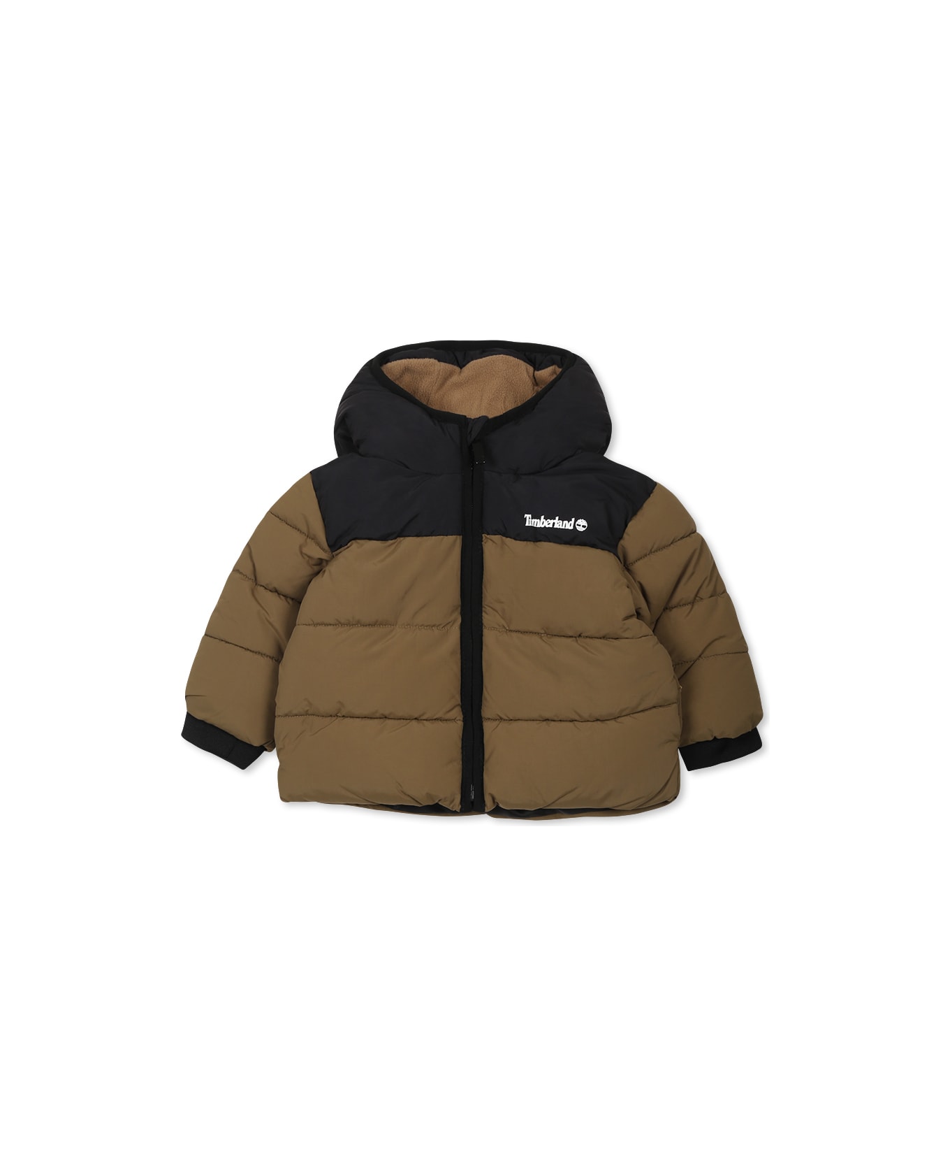 Green heavyweight, padded and quilted down jacket, long sleeves, with hood, front zip fastening, side pockets, ribbed cuffs, faux fur lining in the hood and pockets; made from recycled polyamide. It is embellished with logo on the chest.