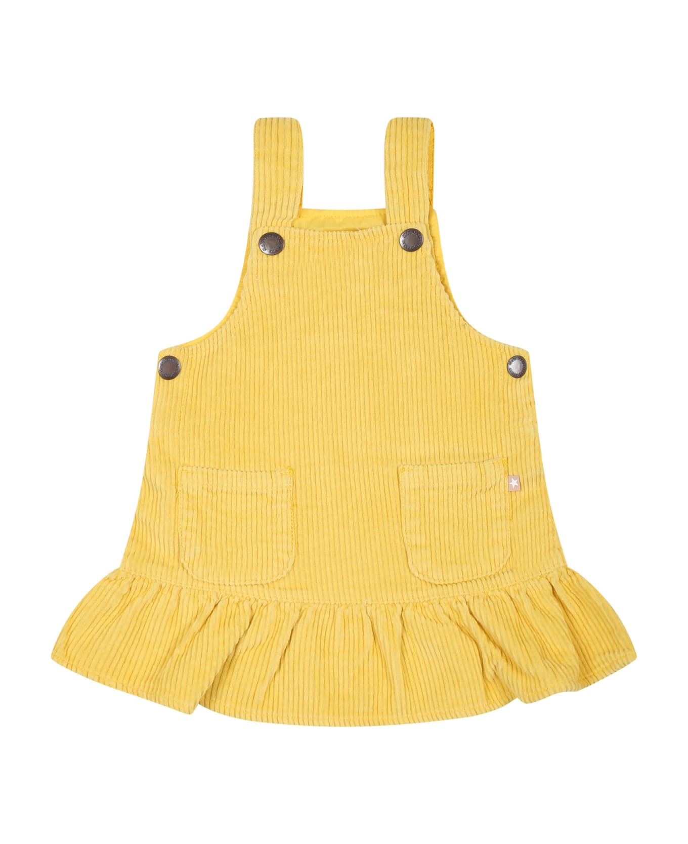 Yellow dungarees in corduroy, shoulder straps with automatic button, closure with automatic buttons on the sides, side pockets and flounce on the bottom.
