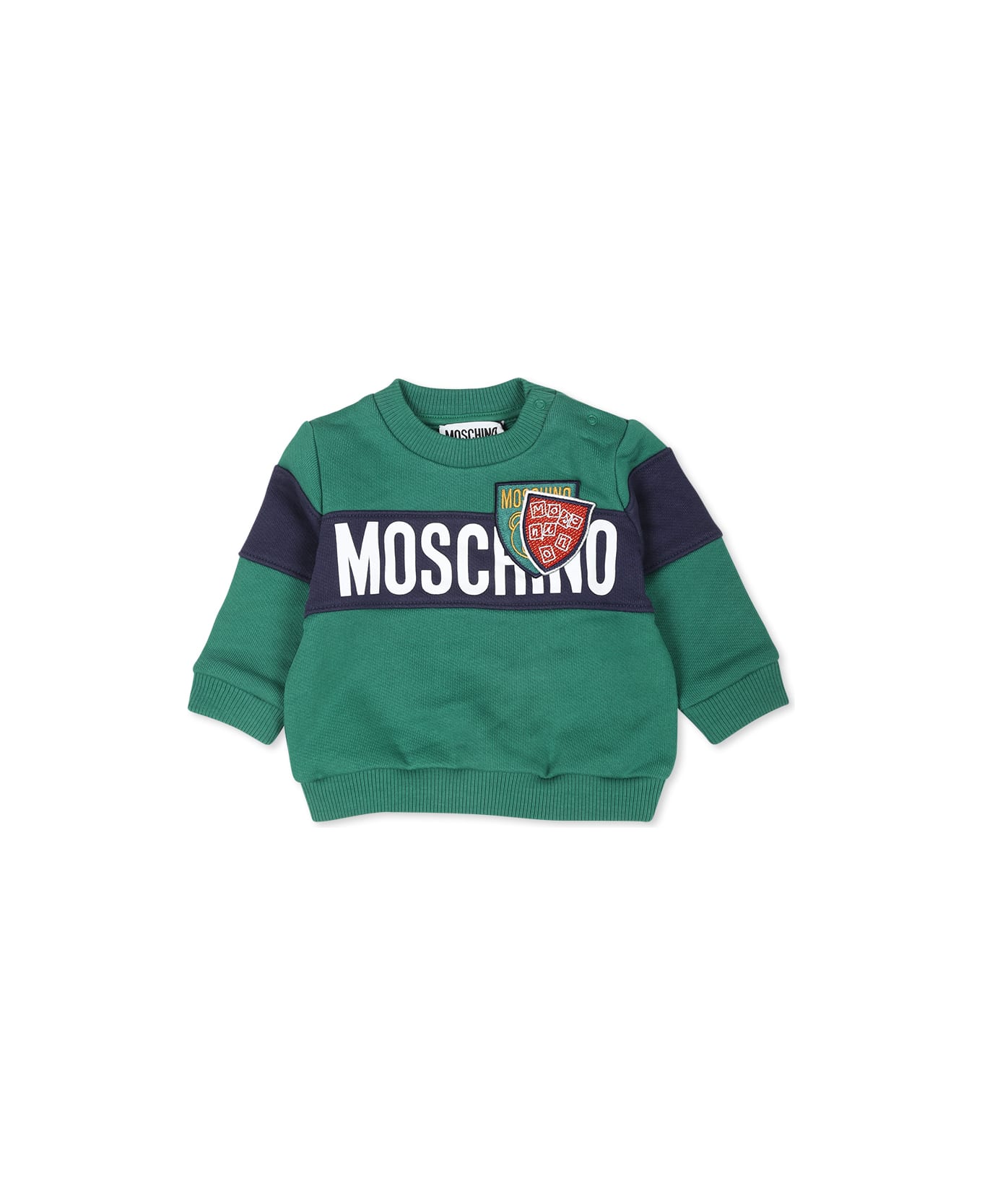 Green sweatshirt from the Moschino Kids brand, in slightly fleeced cotton, with long sleeves, ribbed crew-neck, snap button closure on the shoulder, ribbed cuffs and hem, contrasting blue band on the front and on the sleeves. It is embellished with embroidered logo and badges on the front.
