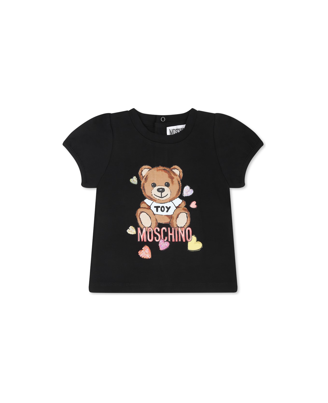 Black t-shirt from the Moschino Kids brand, made of cotton blend, with short sleeves, ribbed crew neck and snap button closure on the back. It is embellished with Teddy Bear, sequin hearts and logo on the front.