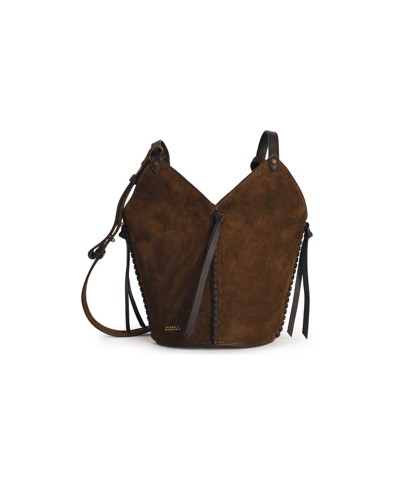 Suede bucket bag with plaited details, to carry on the shoulder or shoulder, adjustable smooth leather shoulder strap with studded buttons, smooth leather loops and metal rivets, braided smooth leather details, leather knot closure, twill lining, embossed leather inner pocket\n34 x 29 x 18 cm