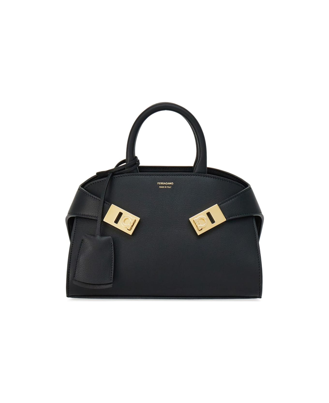 black calfskin two rolled top handles adjustable detachable shoulder strap clip-lock fastening hanging key fob embossed logo to the front open top main compartment internal card slots leather lining gold-tone hardware