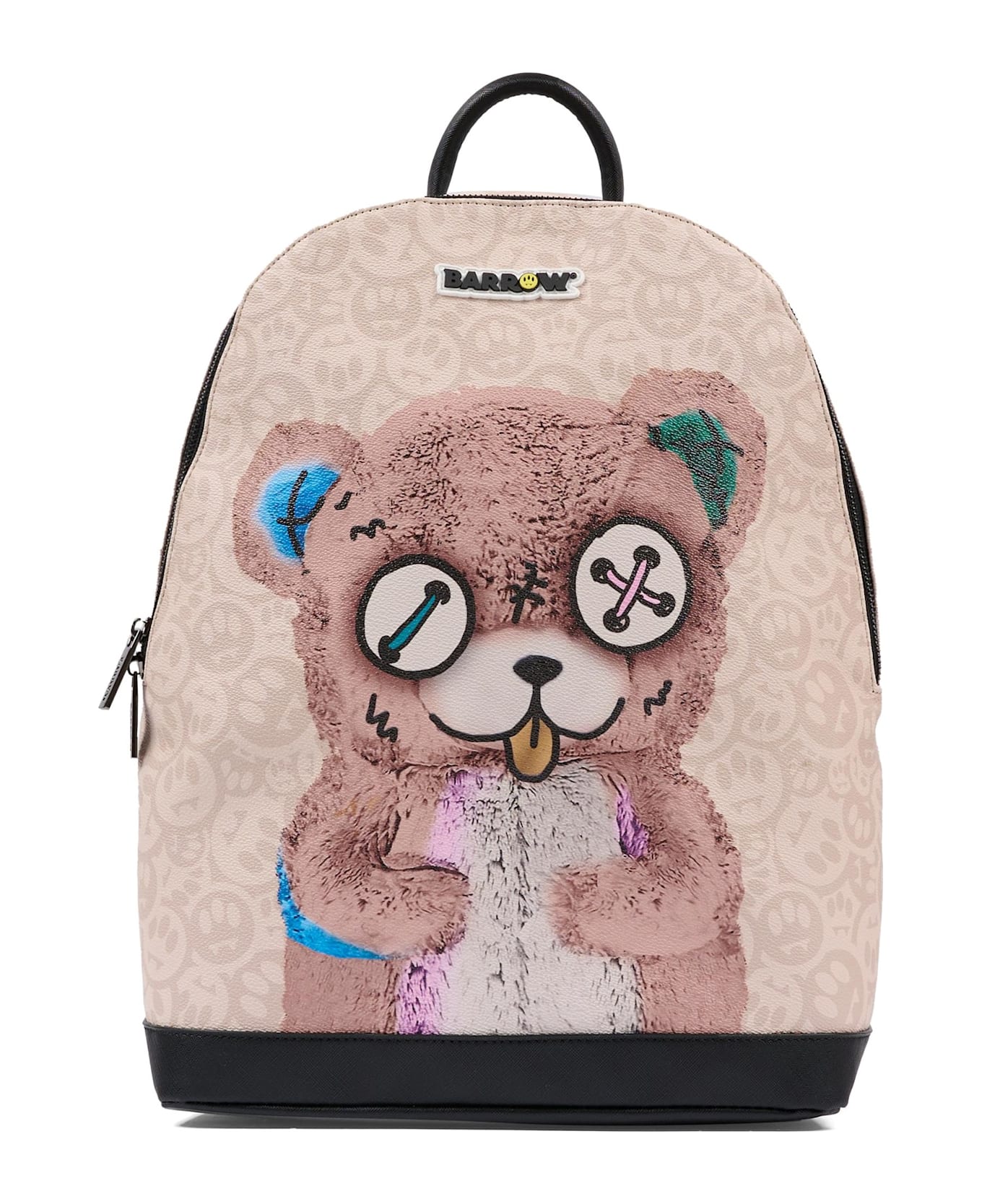 Beige faux leather backpack with a top handle, zip closure, laptop pocket, adjustable shoulder straps, and a padded back with a smiley face and logo. It is embellished with a Bear print and rubberized logo on the front.
