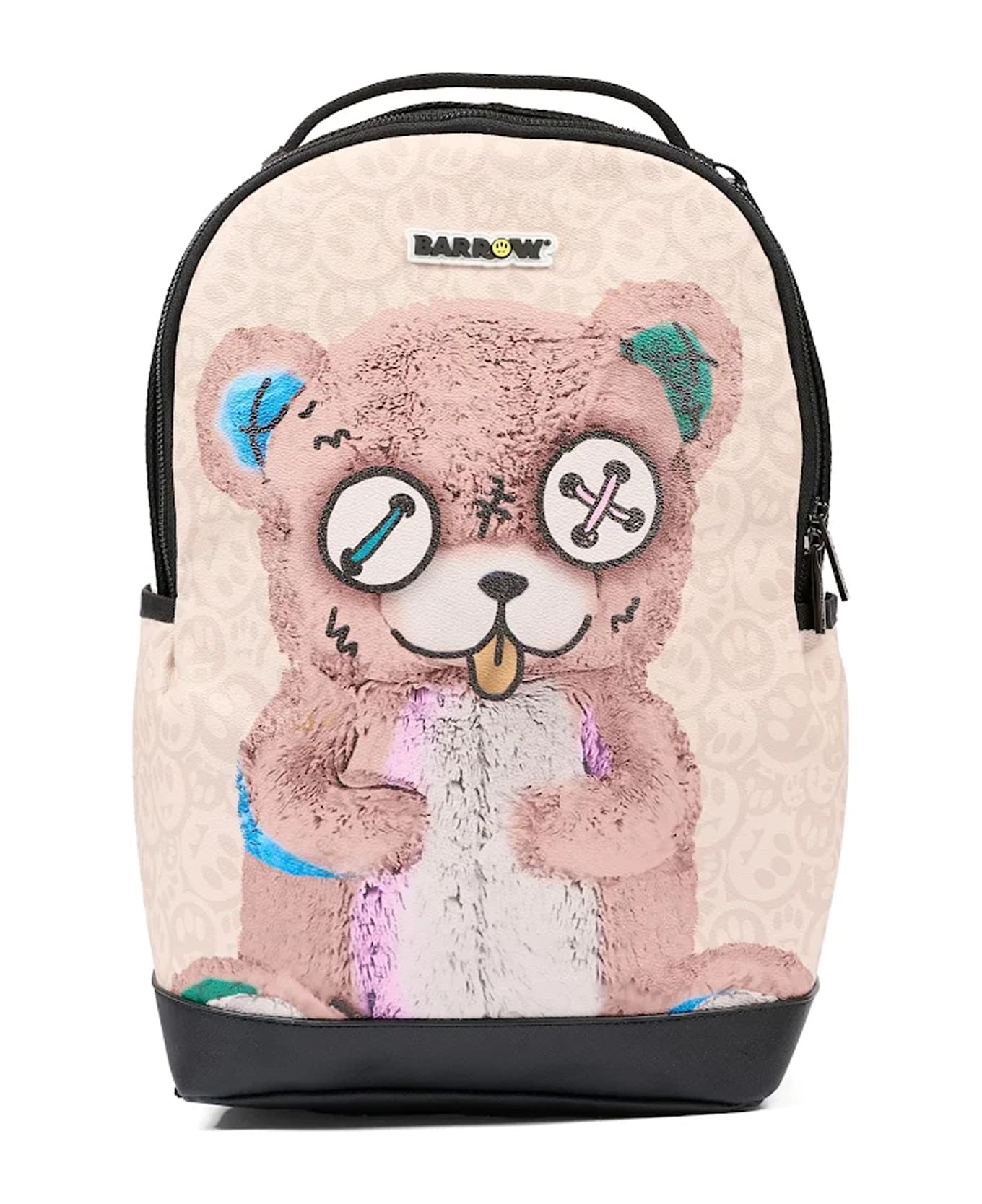 Beige faux leather backpack with top handle, zip closure, back zip pocket, side pockets with Velcro closures, black details, adjustable shoulder straps, and padded back with smiley and logo. It is embellished with a Bear print and rubberized logo on the front.