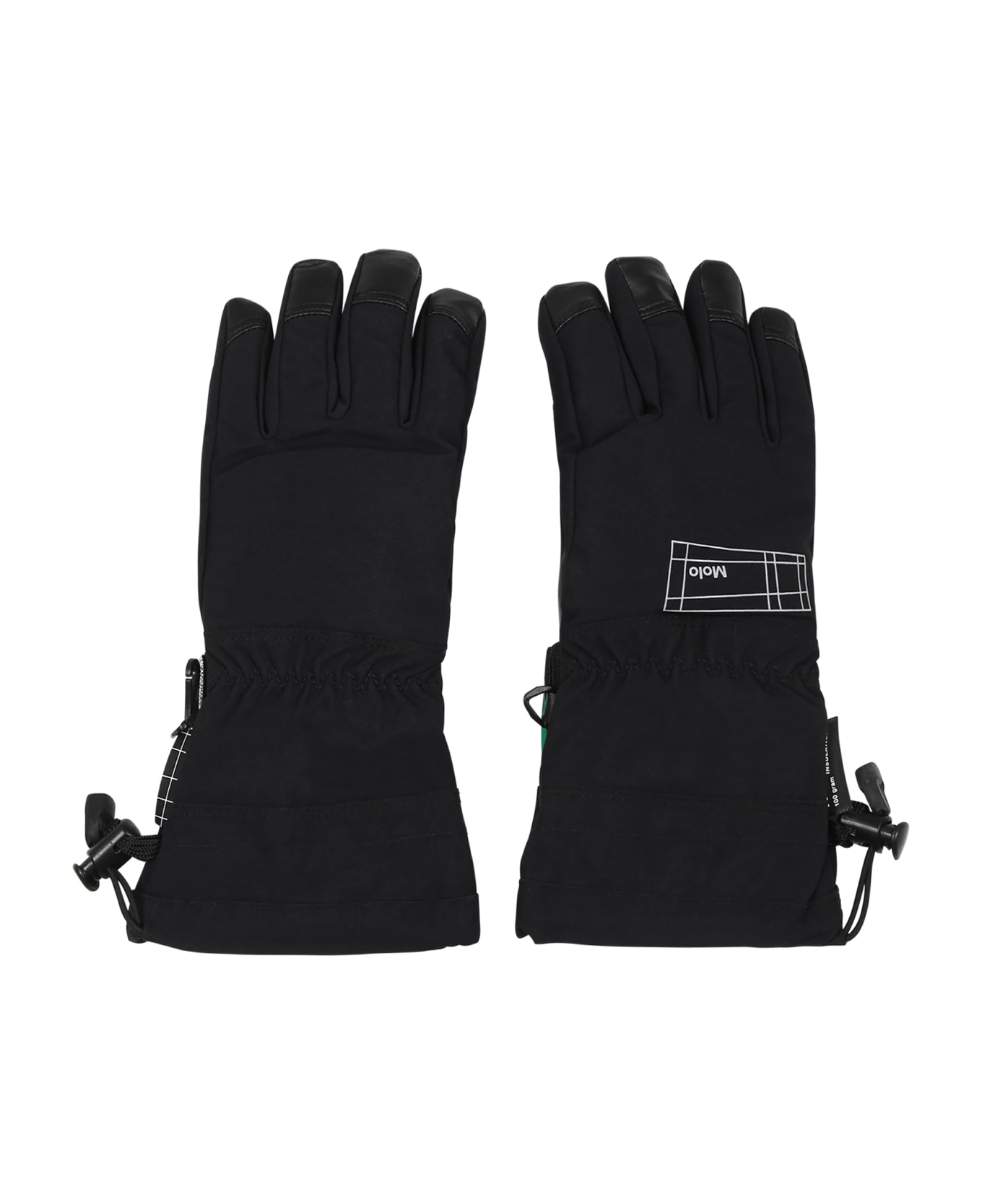 Black padded snow gloves, waterproof and breathable, with adjustable velcro closure, drawstring hem. They are embellished with logo on the front; made from recycled content.