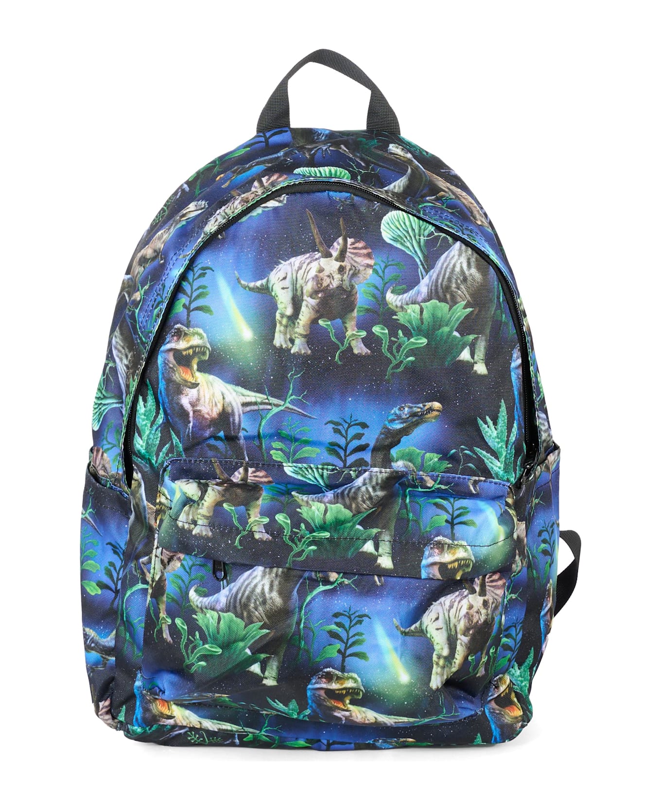 Blue backpack in recycled polyester, with handle, top zip closure, front zip pocket, side pockets and adjustable shoulder straps with snap buckle. It is embellished with an all-over dinosaur print.