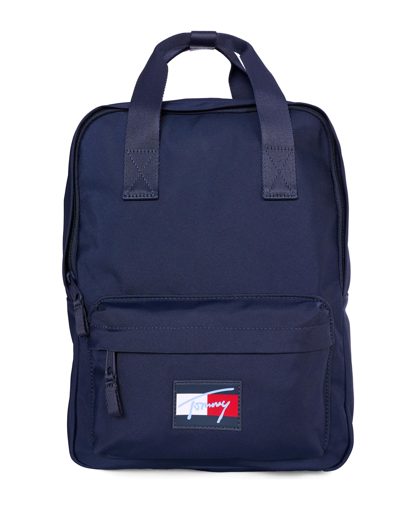 Blue fabric backpack with adjustable shoulder straps, handles on top, front zipped pocket and zip fastening on the top. Embellished with logo patch on the front.