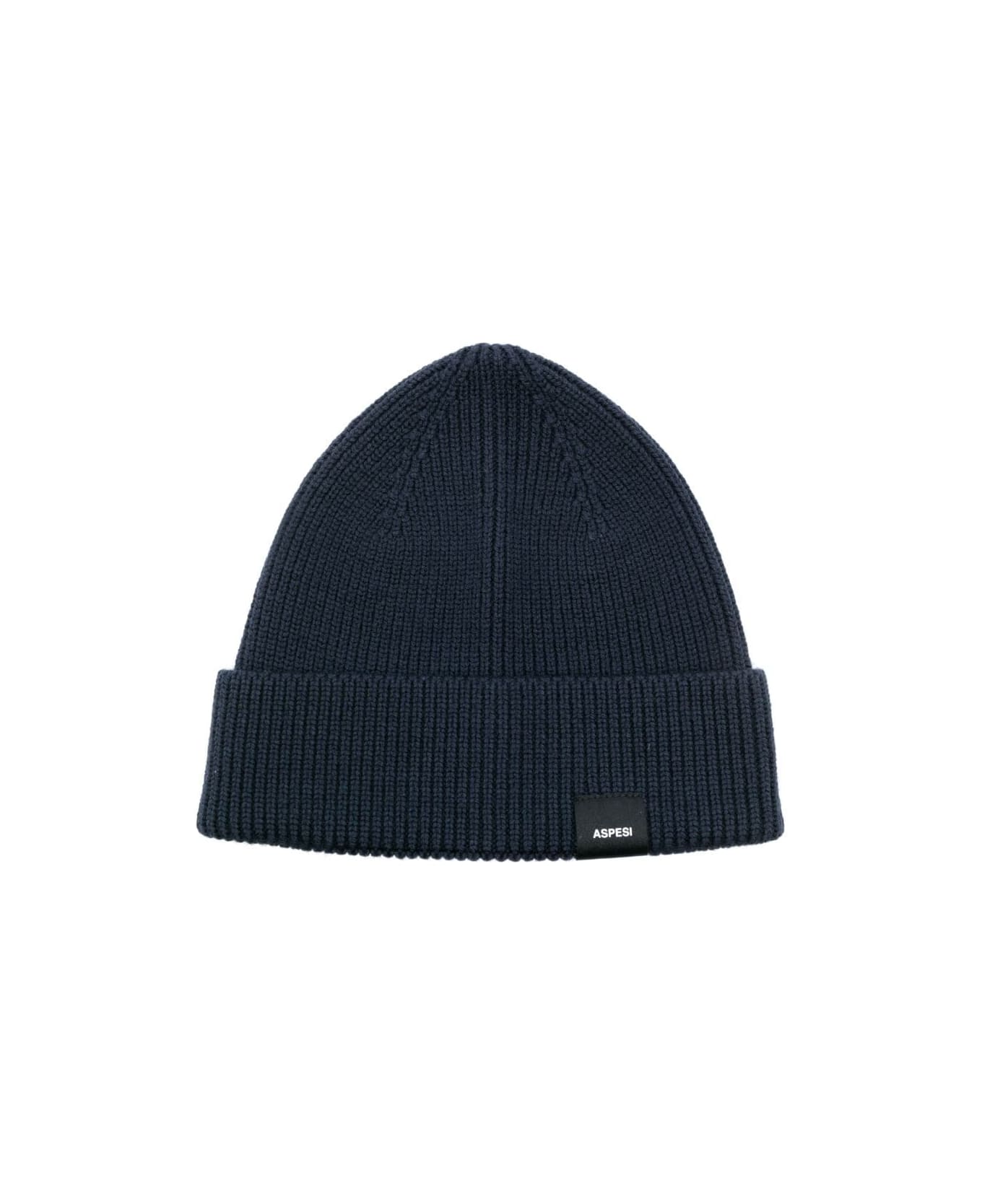 Aspesi Kids beanie made of ribbed navy blue wool with logo label sewn onto the lapel.