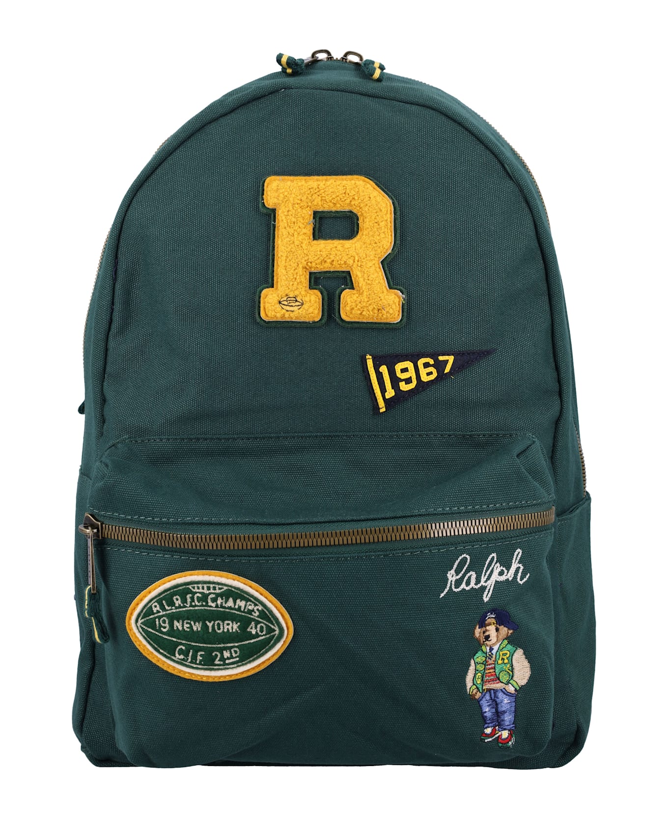 Varsity Backpack By Polo Ralph Lauren. Featuring: Top Handle Two Zip Compartments Front Zip Pocket Multiple Varsity Patch And Bear Embroidery At Front Bottle Pocket At Side Internal Zip Pocket Interior Laptop Sleeve Adjustable Shoulder Straps Height: 45 Cm Width: 32 Cm Depth: 14 Cm