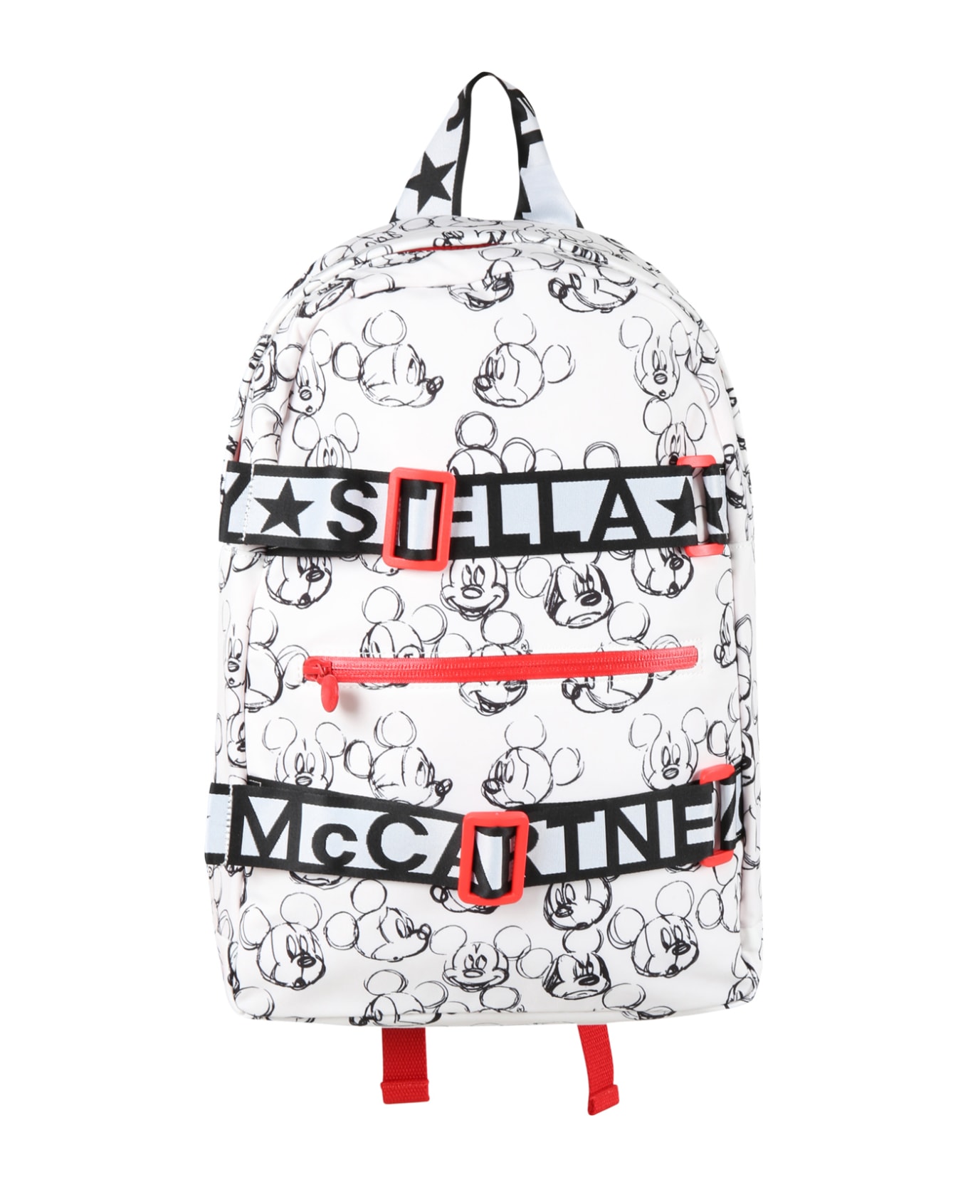 White backpack, made from recycled polyester, with adjustable belts on the front, zipped pocket and zipped closure. It s embellished with all-over Mickey Mouse and logo on the belts. This article is in collaboration with Disney.