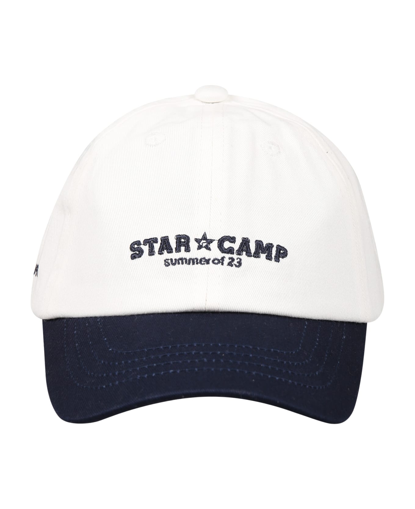 White hat, with blue visor, adjustable closure on the back. It is embellished with embroidered "Star camp" writing on the front and blue logo on the side.