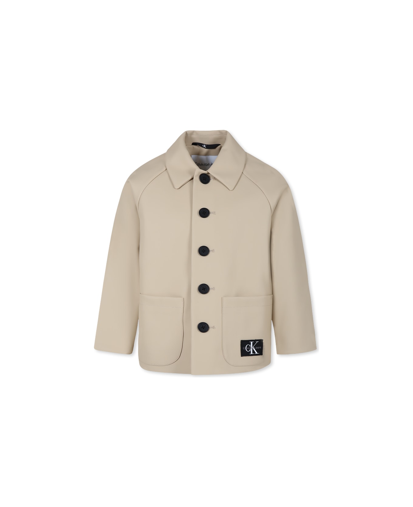 Lightweight beige raincoat, long sleeves, with collar, front closure with buttons and patch pockets on the front. It is embellished with a front logo patch.