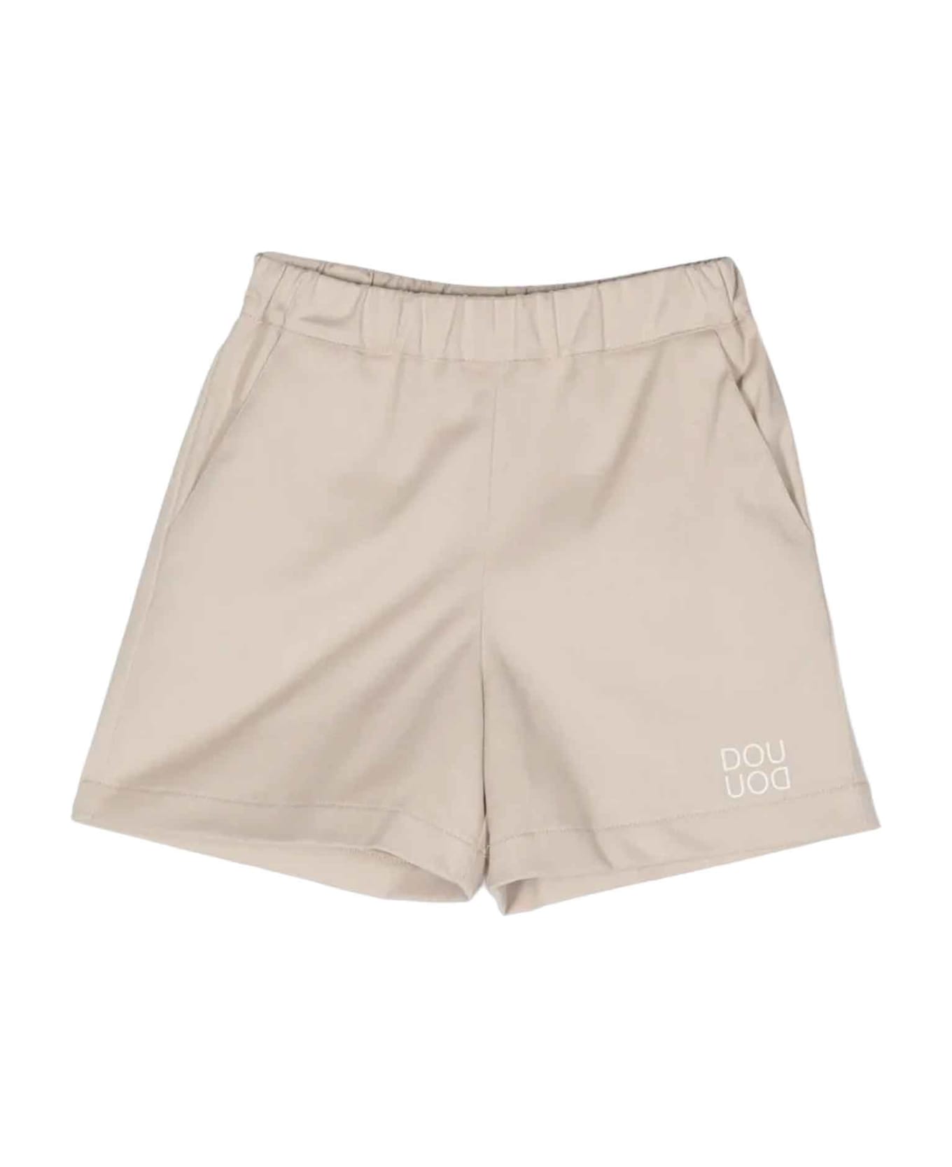 Beige shorts boy. Logo print on the front, elasticated waist, two side diagonal pockets, straight cut and above the knee length. Cotton 97%, Spandex/Elastane 3%
