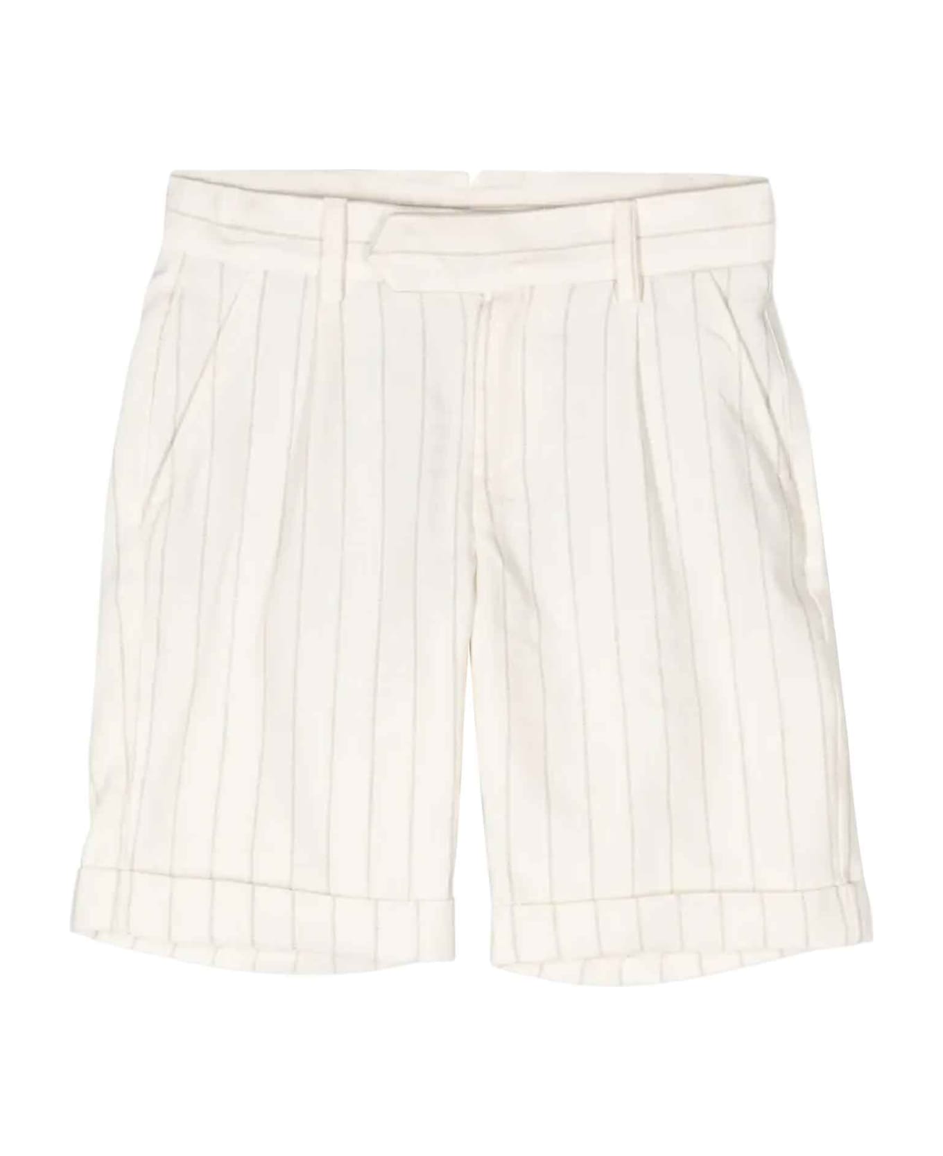 beige shorts boy. Vertical striped design, box pleat detail, mid rise, belt loops, front concealed fastening, two patch pockets, two back flap pockets, turned up hem and above the knee length. Linen 52%, Cotton 48%