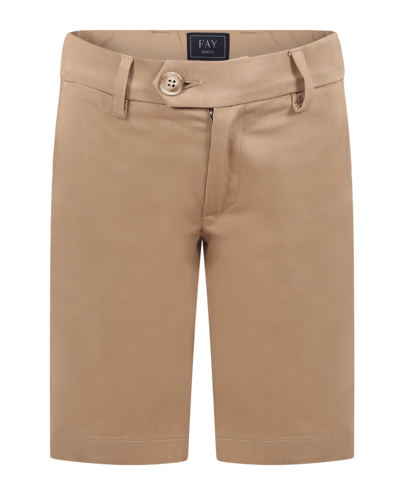 Beige shorts, with belt loops, zip and button closure, adjustable waist thanks to internal elastic bands with button, side and back welt pockets. They are embellished with embroided logo, on the back.