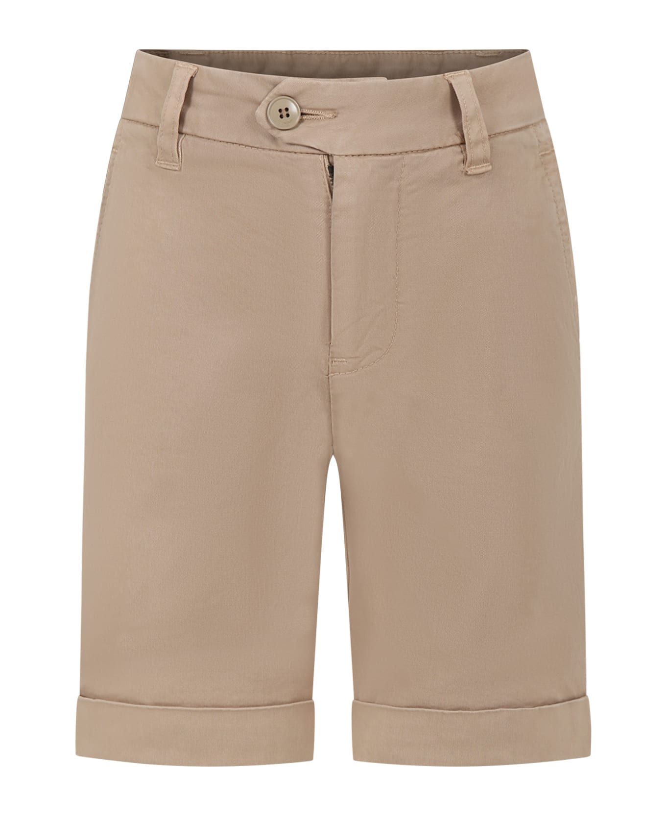 Beige shorts in cotton blend, with belt loops, front closure with zip and button, adjustable waist thanks to internal elastic bands with button, side and back pocket, bottom leg with turn-ups. They are embellished with logo patch on the back.