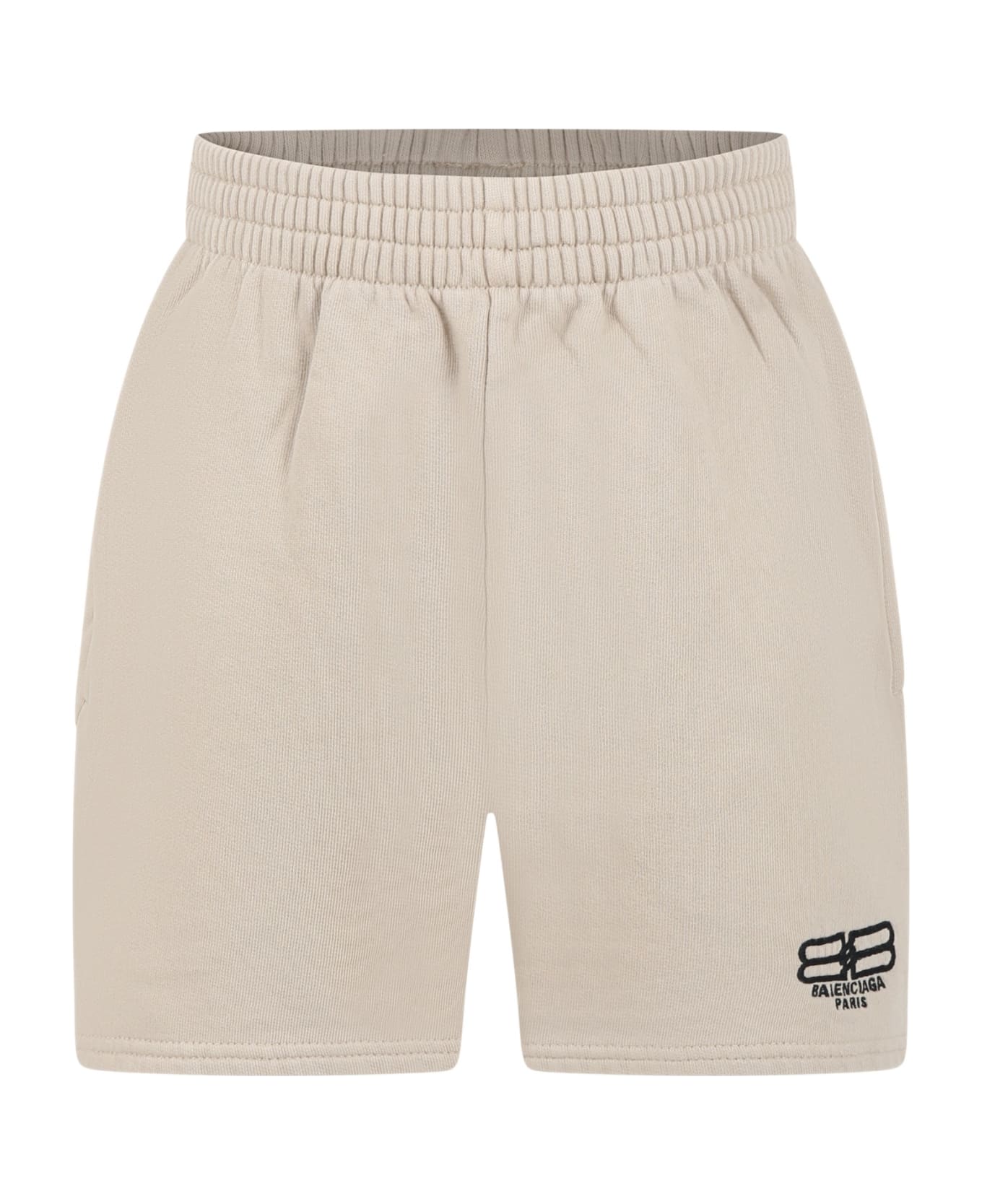 Beige shorts, in brushed cotton, with elastic waistband, pockets on the front. They are embellished with black embroidered logo.