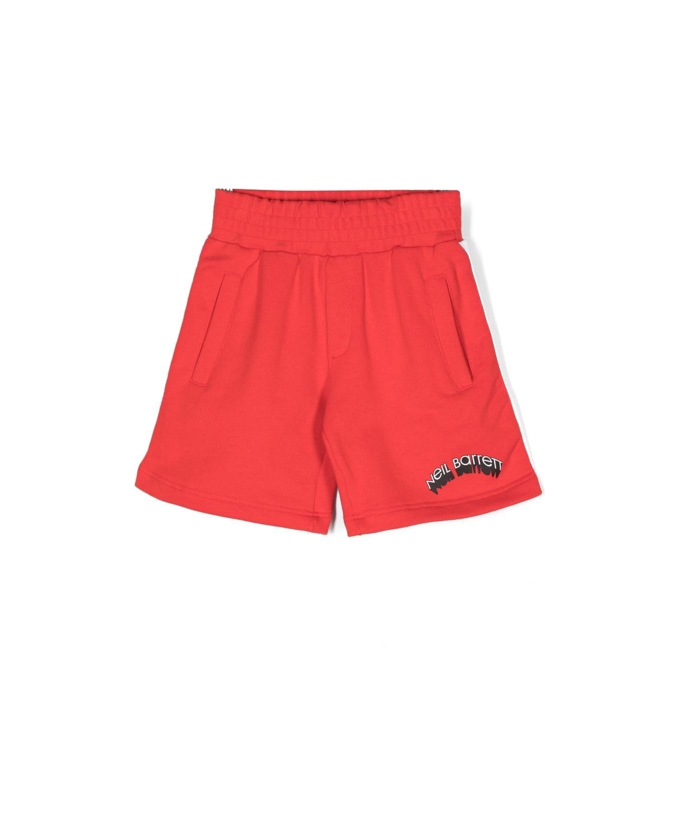 Red bermuda, pockets and front lettering logo, drawstring waist and side bands. 100% cotton