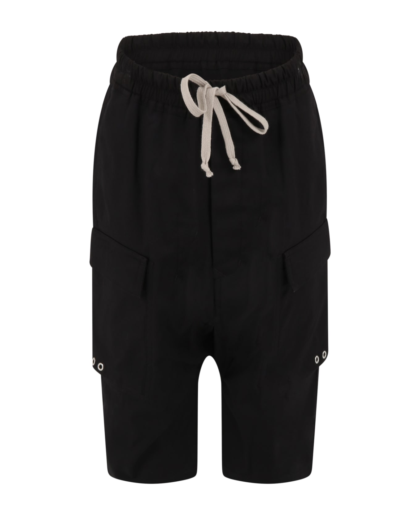 Black cargo pants in organic cotton, with low crotch, elasticated waist with drawstring, side welt pockets, pockets with flap closure on the front and back.