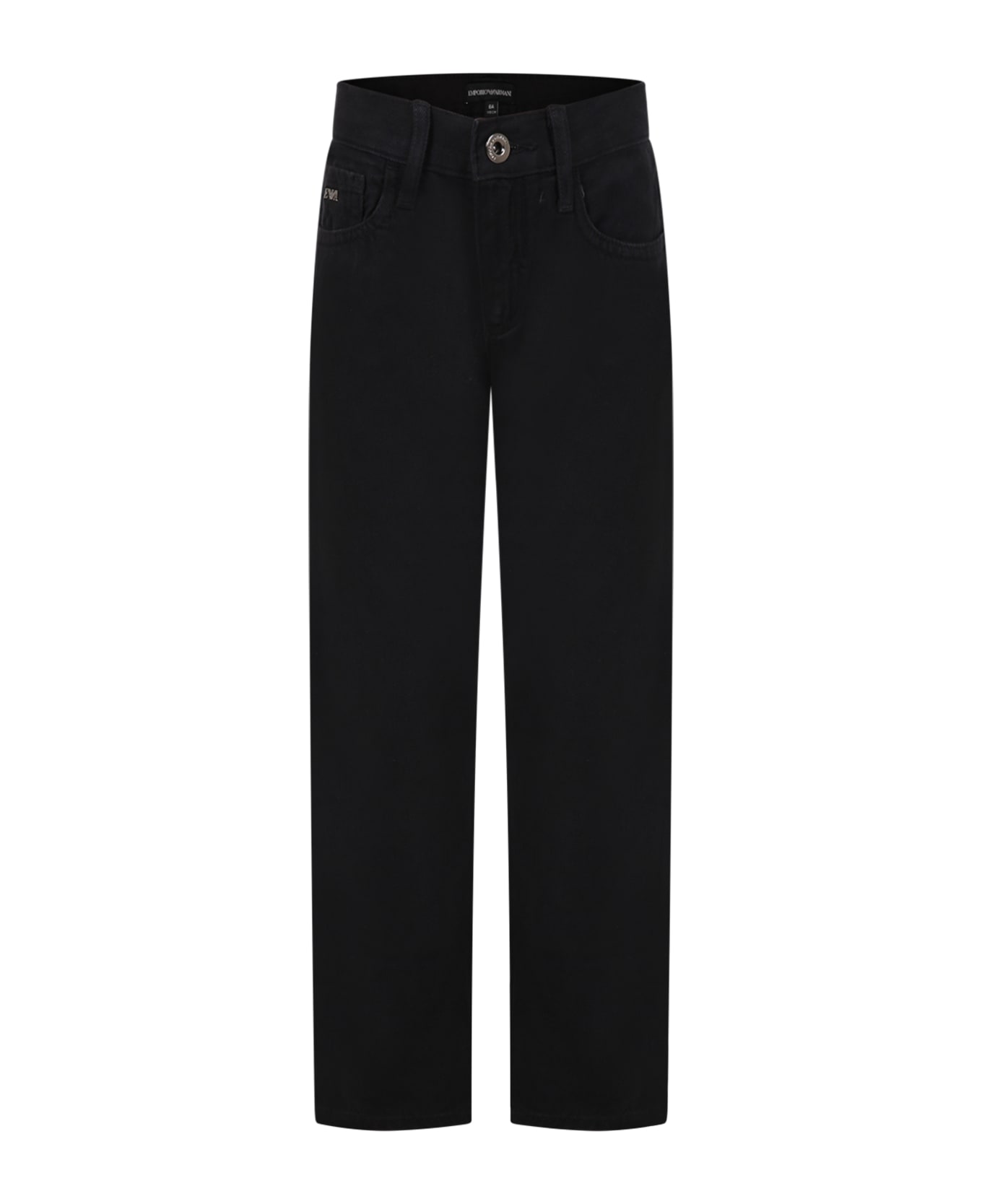 Black denim jeans, five pockets, with belt loops, zip and button closure, adjustable internal elastic. They are embellished with iconic eaglet, on the front and on the back.