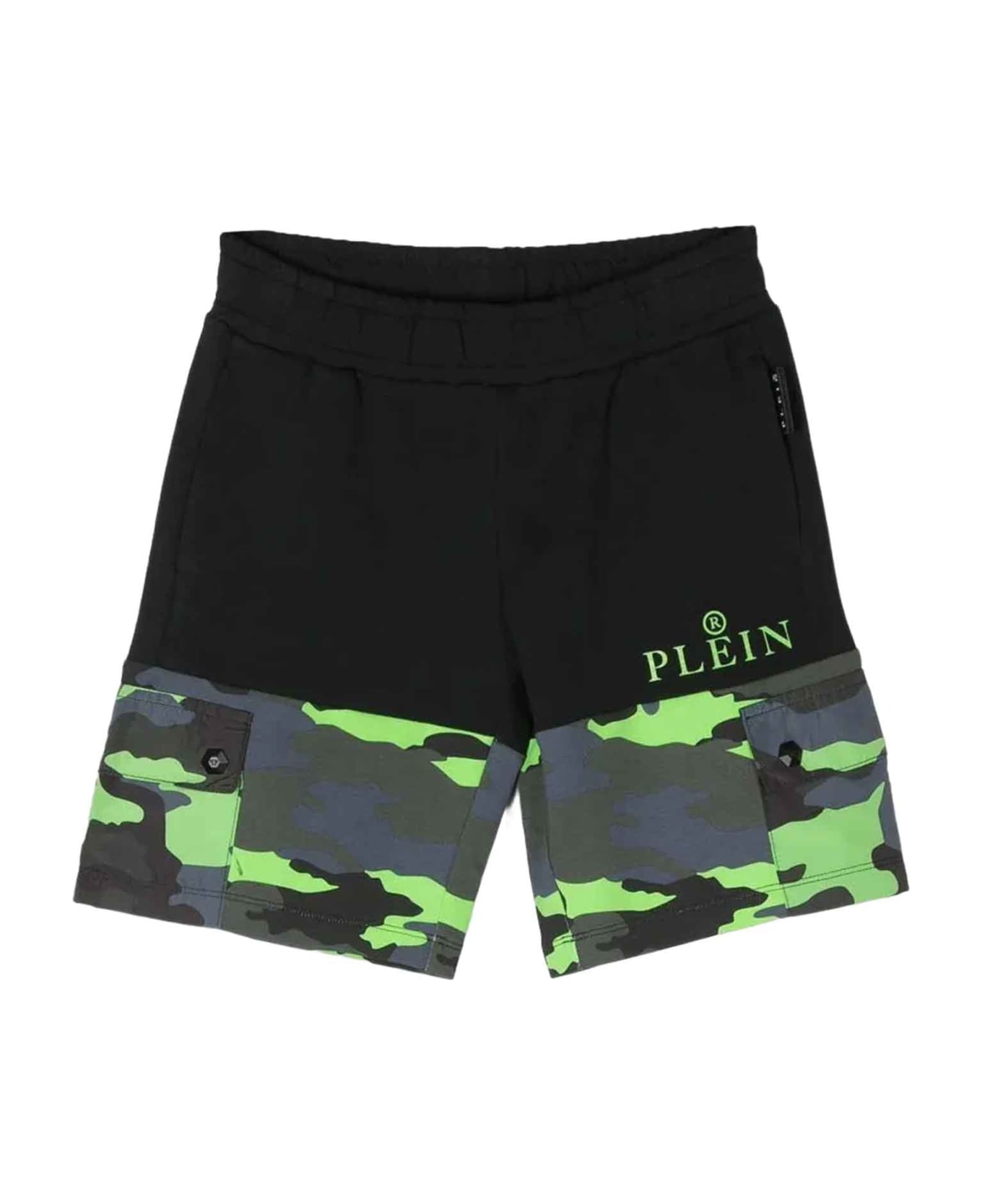 Black shorts boy. Camouflage print, color-block design, engraved front logo, back logo patch, elasticated waist, two side flap pockets and straight hem. Polyester 100%, Cotton 96%, Elastane 4%