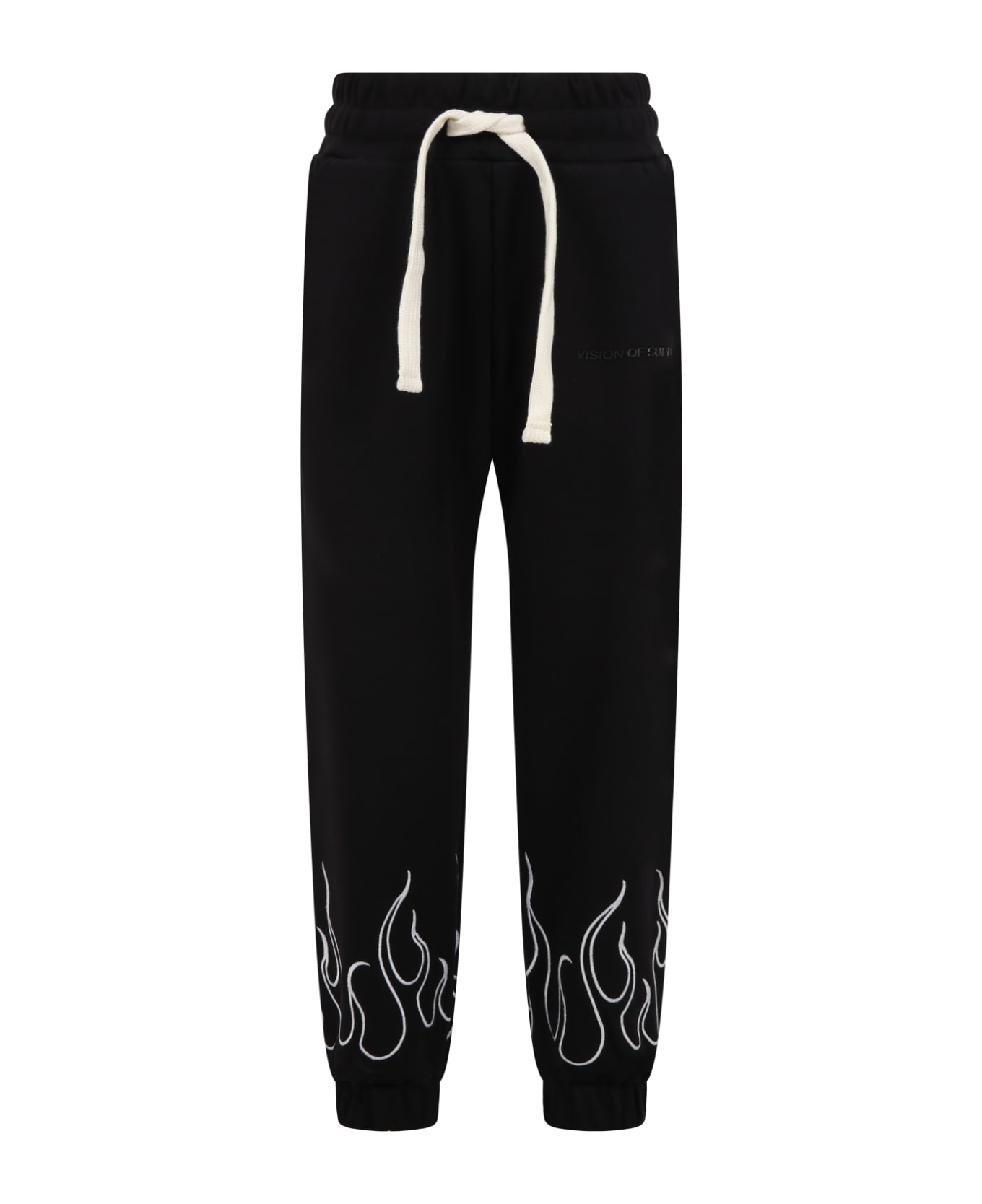 Black trousers, in brushed cotton, with elastic waistband and drawstring, side pockets. They are embellished with embroidered flames on the bottom and rubberized logo on the front.