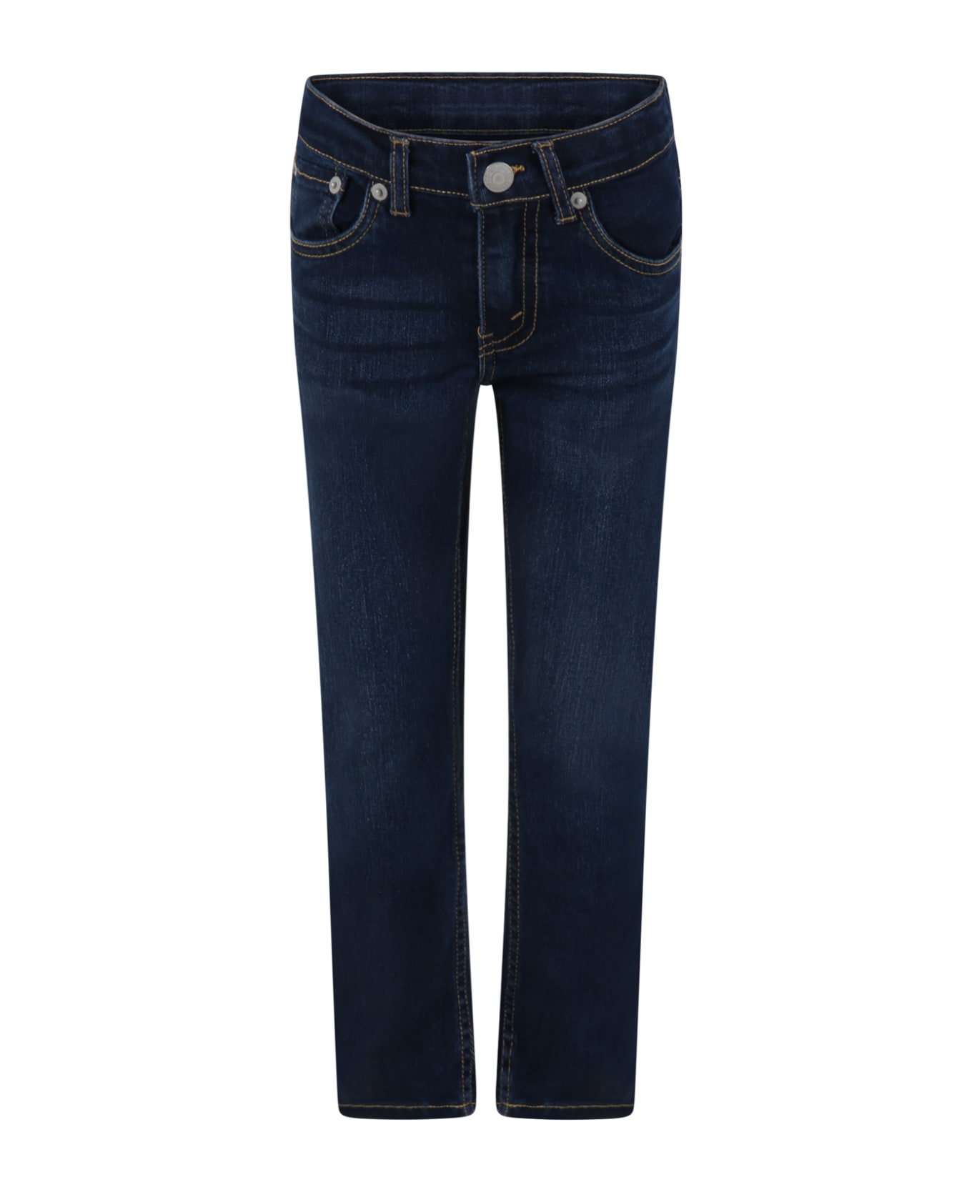 Five-pocket denim blue jeans, with adjustable waist thanks to internal elastics with button, belt loops and clip and zip closure on the front. They are embellished with a logo patch on the back.