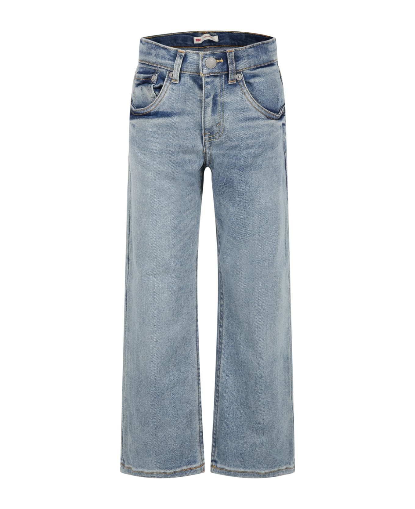 Blue denim jeans, five pockets, belt loops, zip and button closure, adjustable waist thanks to internal elastics. They are embellished with logo patch, on the back.