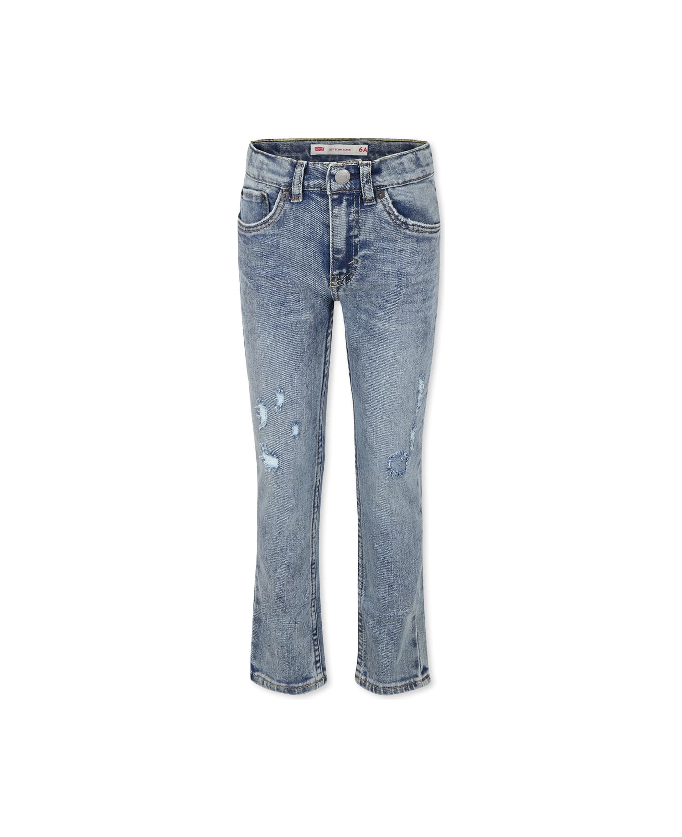 Blue denim jeans, five pockets, with belt loops, front zip and hook fastening, elasticated waist and fake worn-effect rips on the front. They are embellished with a red logo patch on the back.
