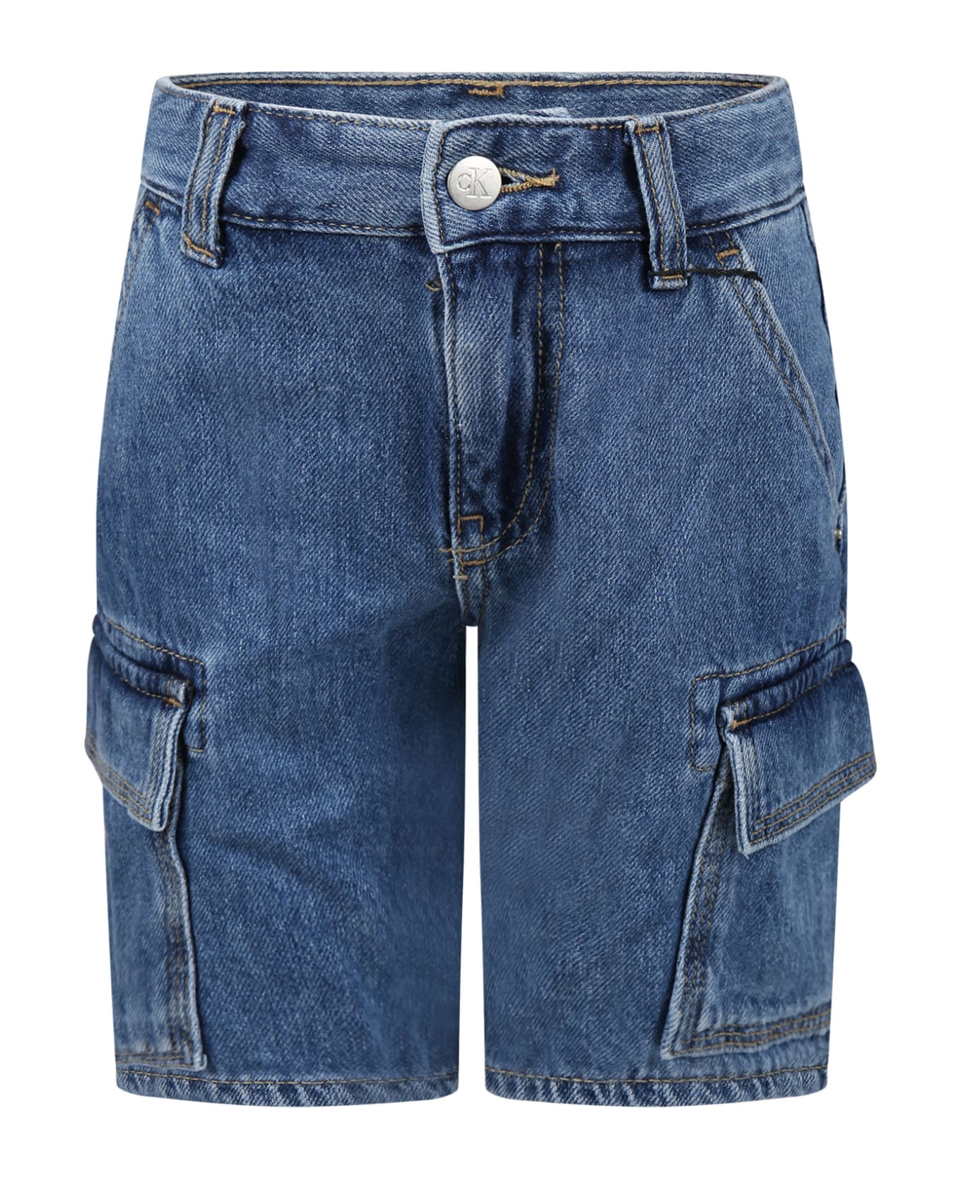 Denim blue shorts, with belt loops, zip and button closure, adjustable waist thanks to internal elastic bands with button, side pockets. They are embellished with logo patch on the back and the front.