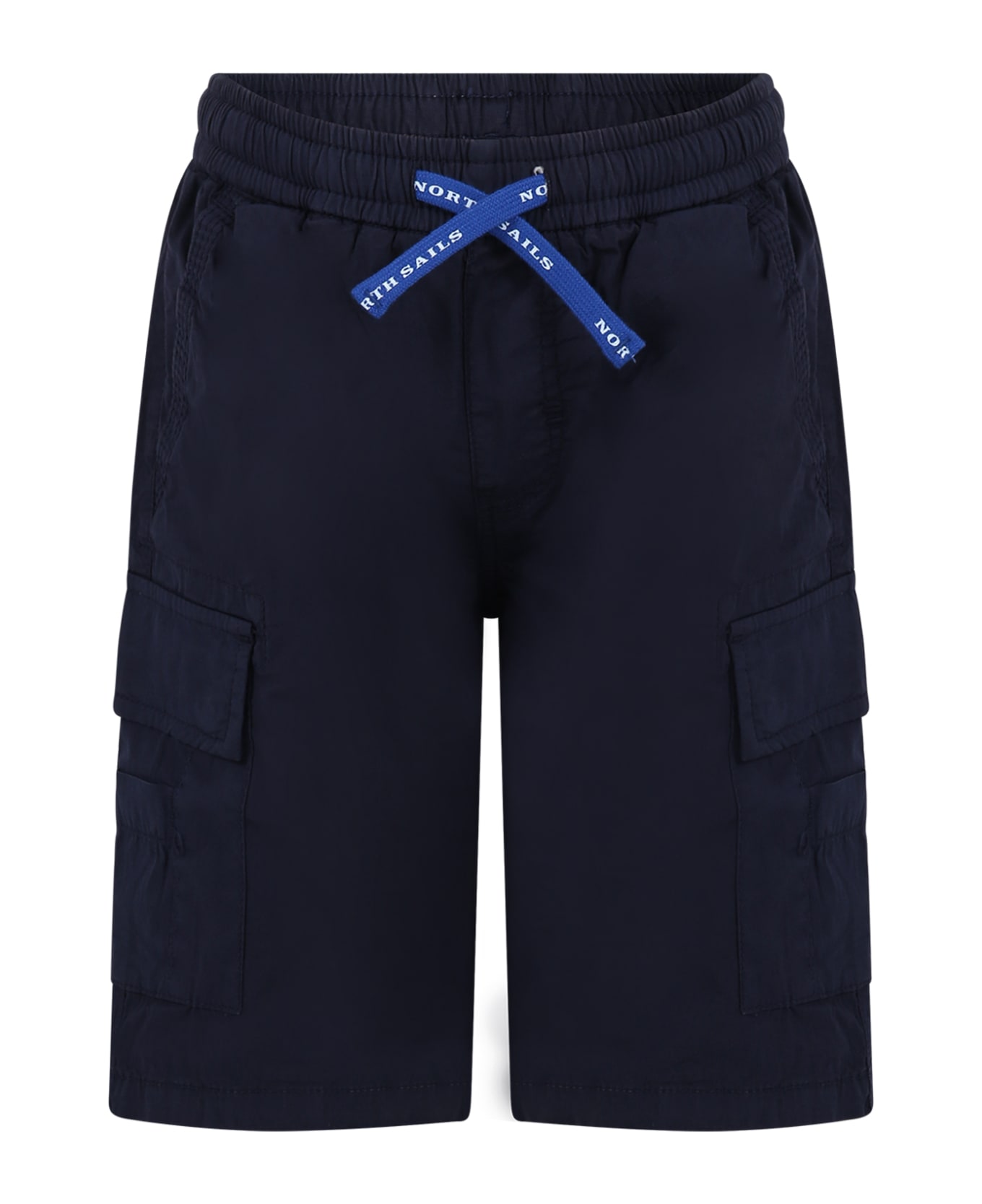 Blue shorts in cotton, elastic waistband and drawstring, belt loops, side pockets, back pockets. It is embellished with logo patch on the back.