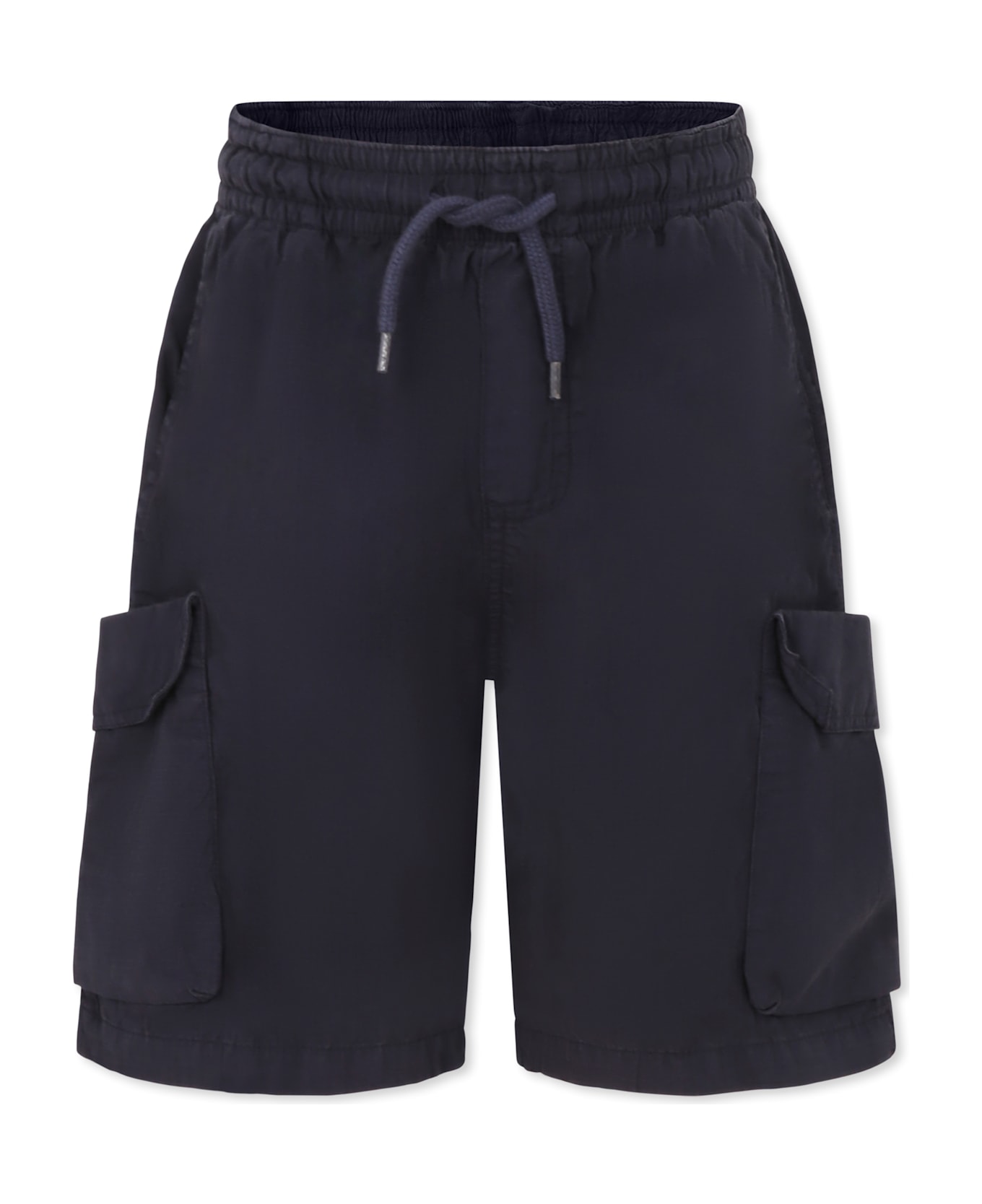 Blue shorts in GOTS certified organic cotton, with elasticated waist, drawstring, side pockets and cargo pockets.