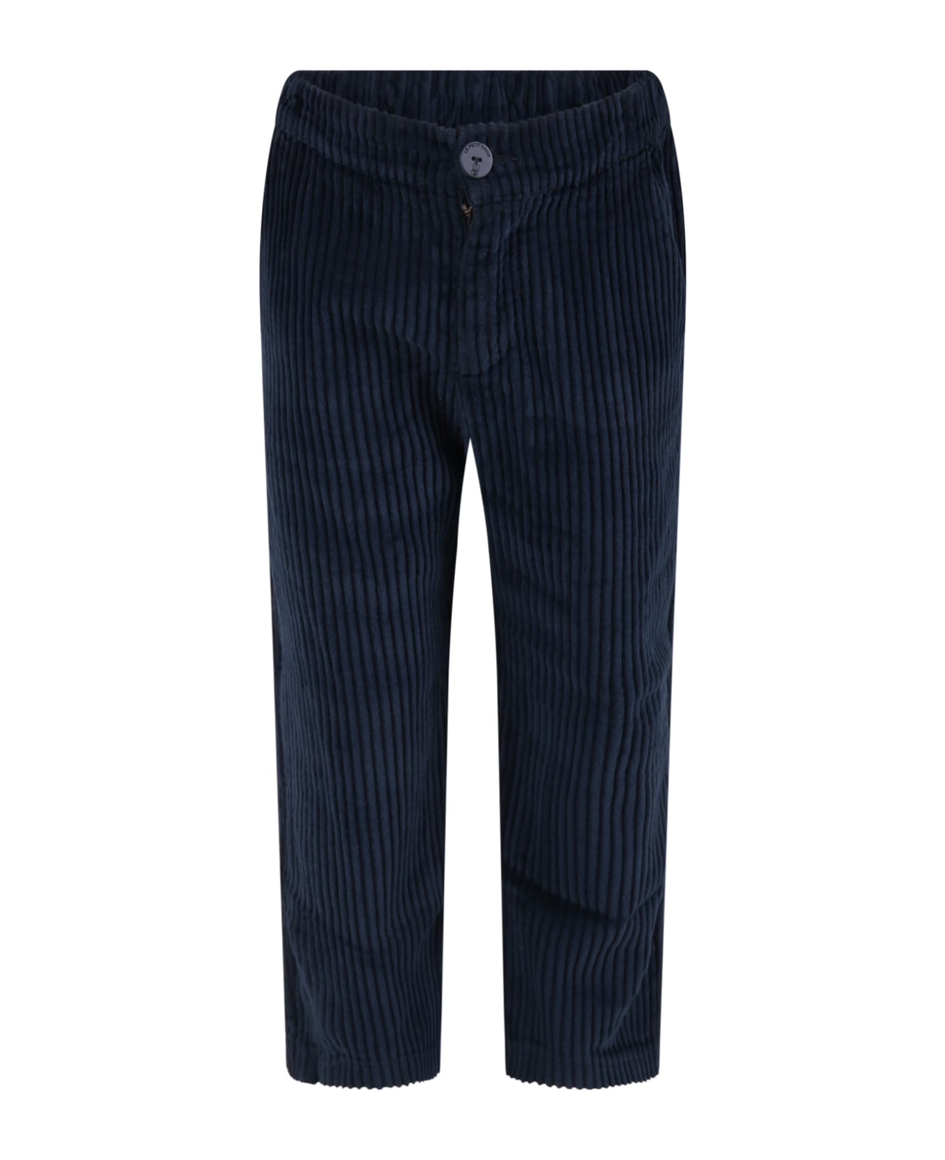 Blue ribbed trouser, with elasticized waistband, press stud closure on the front and side pockets.