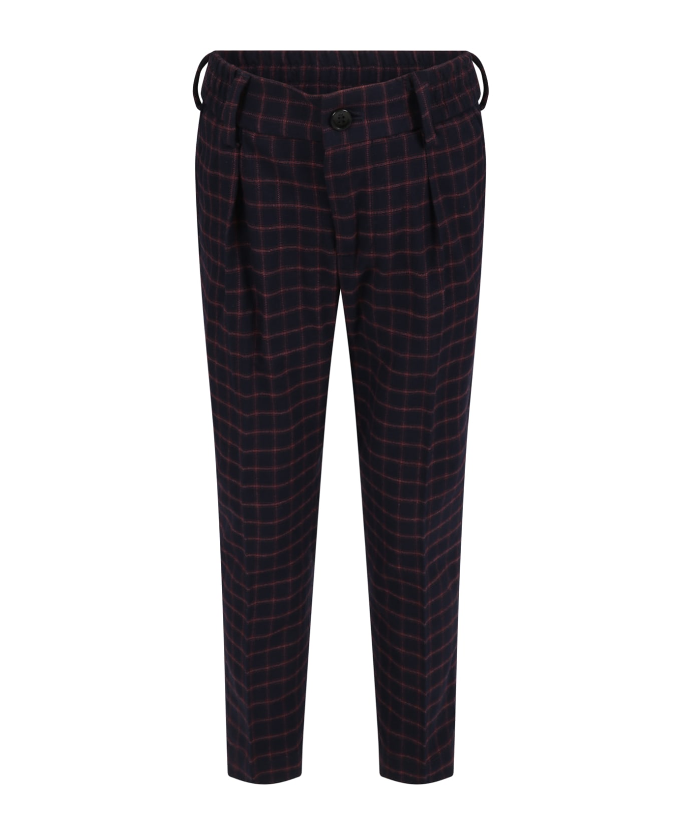 Blue trouser, with elasticized waistband, front pleat, belt loops and buttoned and zipped closure. It is embellished with all-over check.