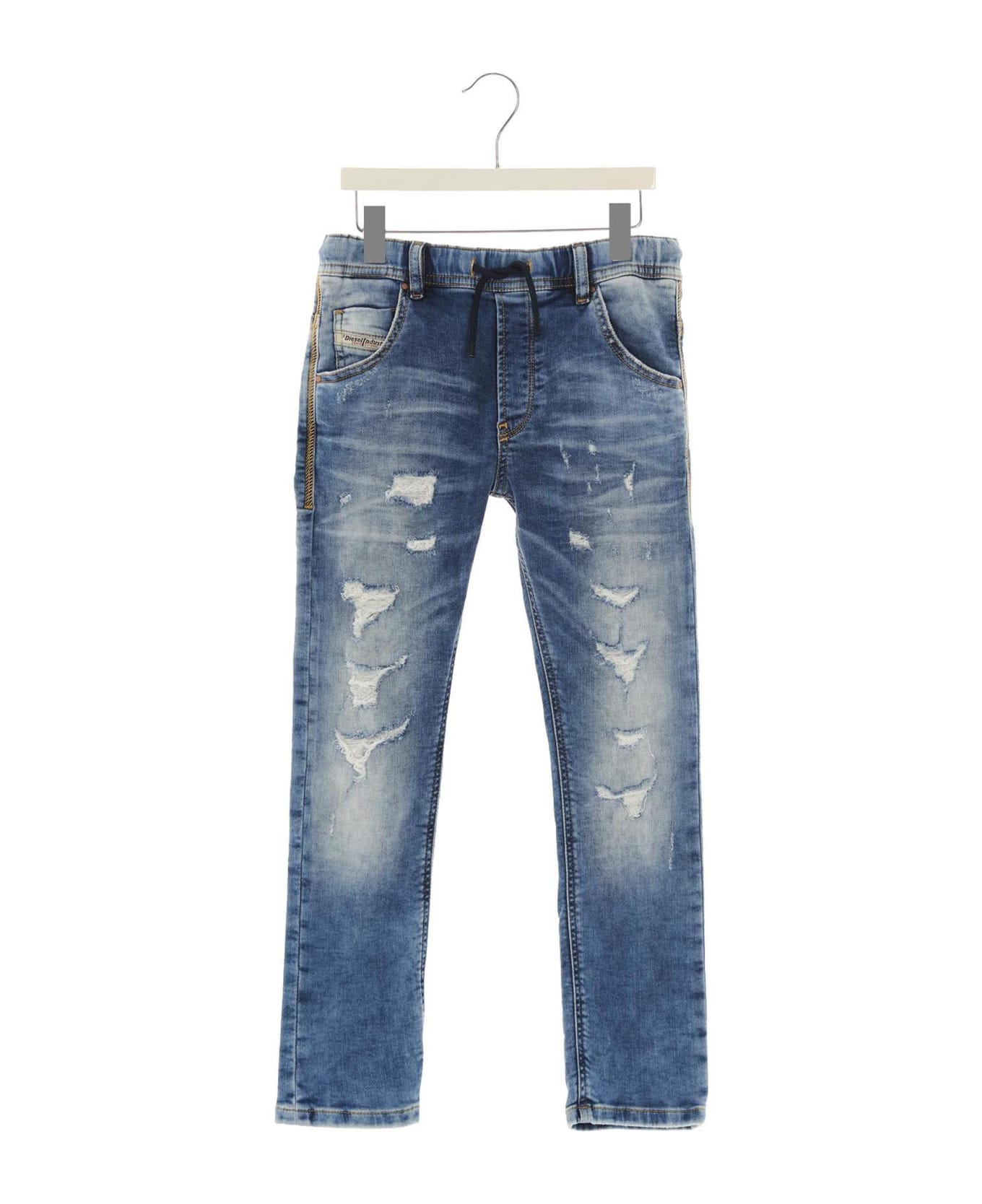 Multioley' cotton denim jeans with n elastic and a drawstring at the waist, five pockets and all-over used-effect details. Composition: 98% cotton 2% elastane