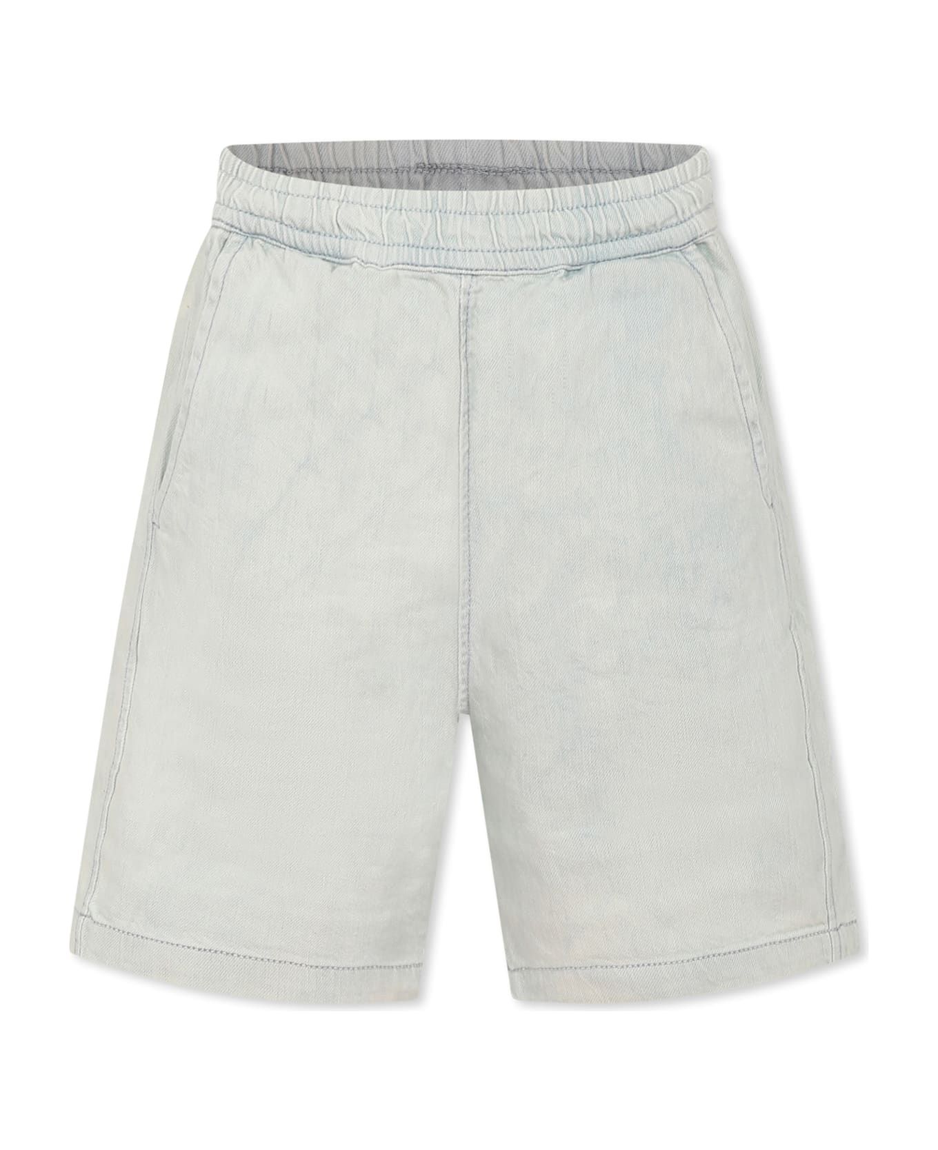 GOTS certified organic cotton denim shorts, with elasticated waist and side pockets. They are dembellished with a logo patch on the back.
