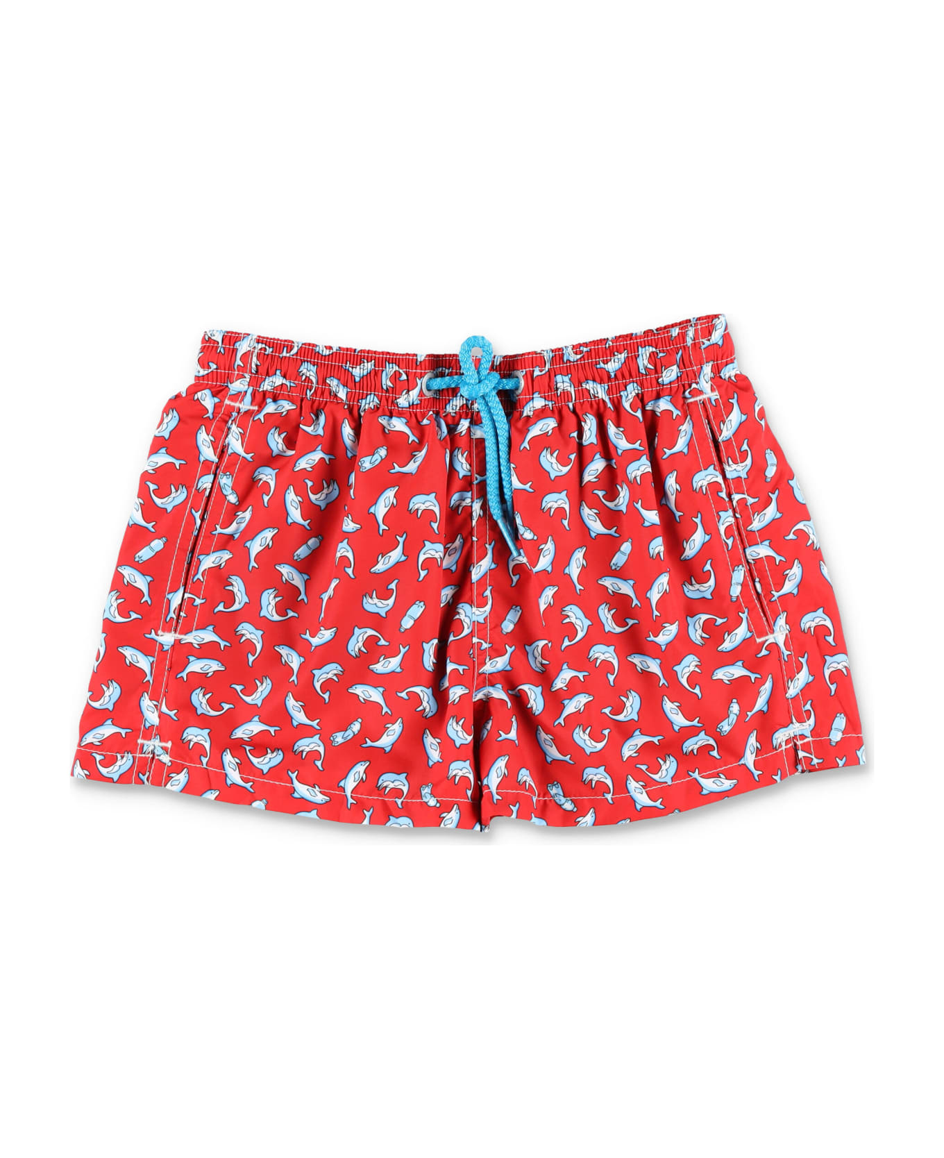 Dolphin Coast Beach Shorts By Mc2 Saint Barth. Featuring: Elasticated Waistband With Drawstring Slit Pockets All-over Dolphin Print Metal Eyelets At Back Pocket With Magnetic Closure Mesh Lining
